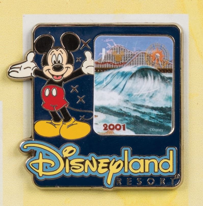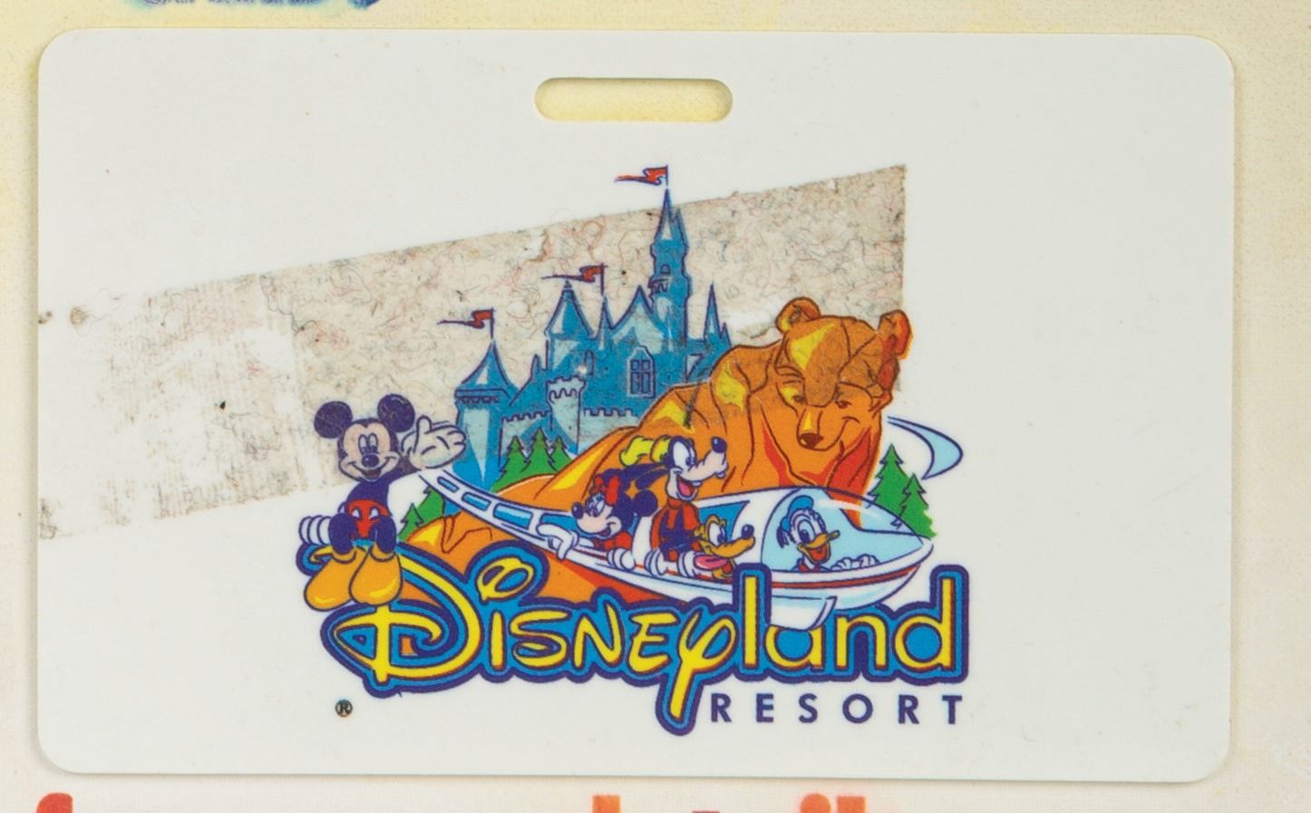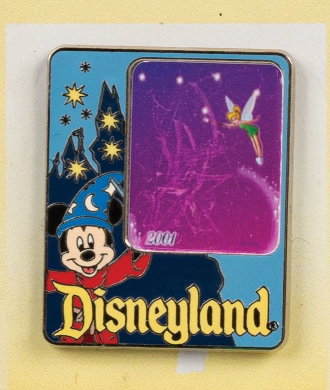 (Disneyland, 2001) A Park-used display for personalized Photo Pins, produced for the Disneyland Resort. These pins allowed guests to put their own photos into a collectible pin or lanyard card. The display features (2) rare pre-production pins exhibiting sticker samples and (2) lanyard card samples. Measuring 11"x8.5", the foam core display is in good condition with some moisture wear and spots of separation, however the samples themselves present very well.