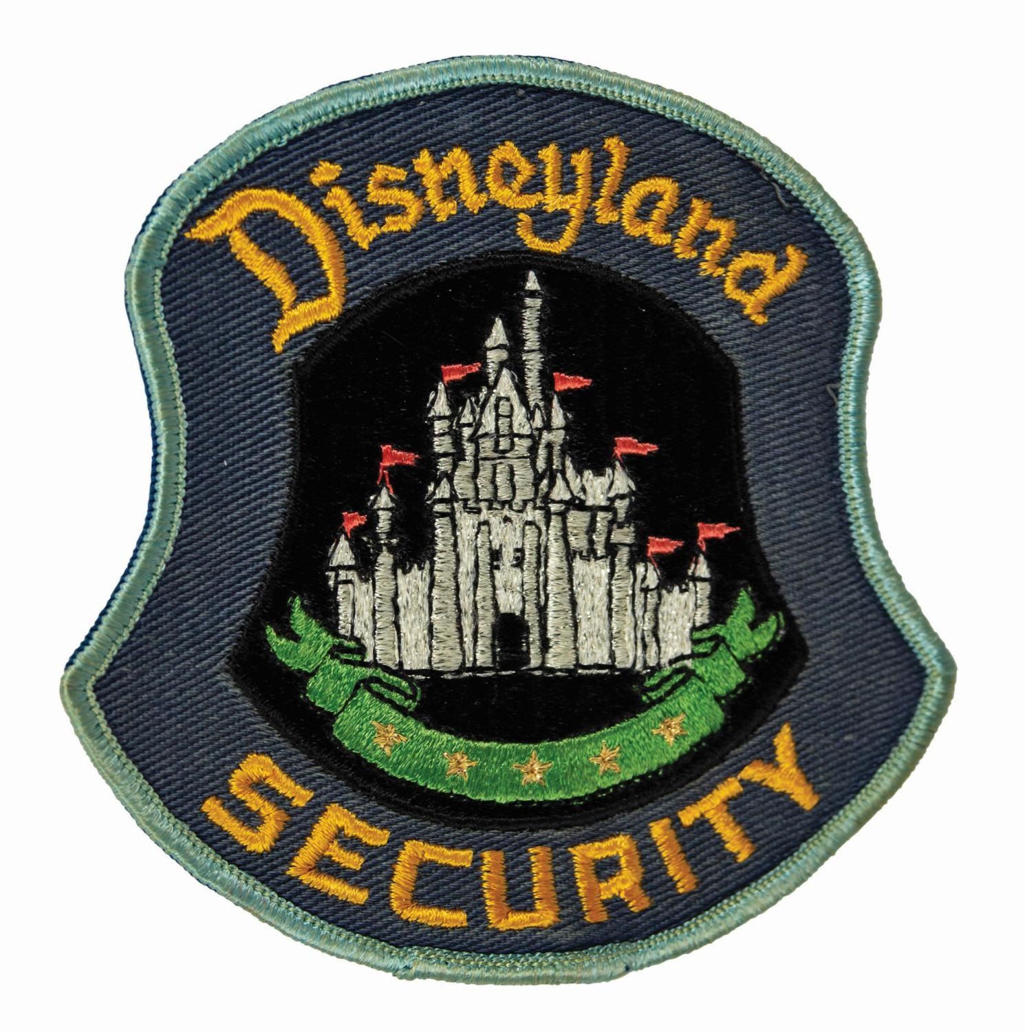 (Disneyland, c.1970s) An embroidered jacket patch for security officers at Disneyland. The park security patch depicts an image of Sleeping Beauty Castle over a banner of five stars. Measuring 4.5"x4.25", the patch is in good condition with minor surface wear and some curling along the bottom edge.