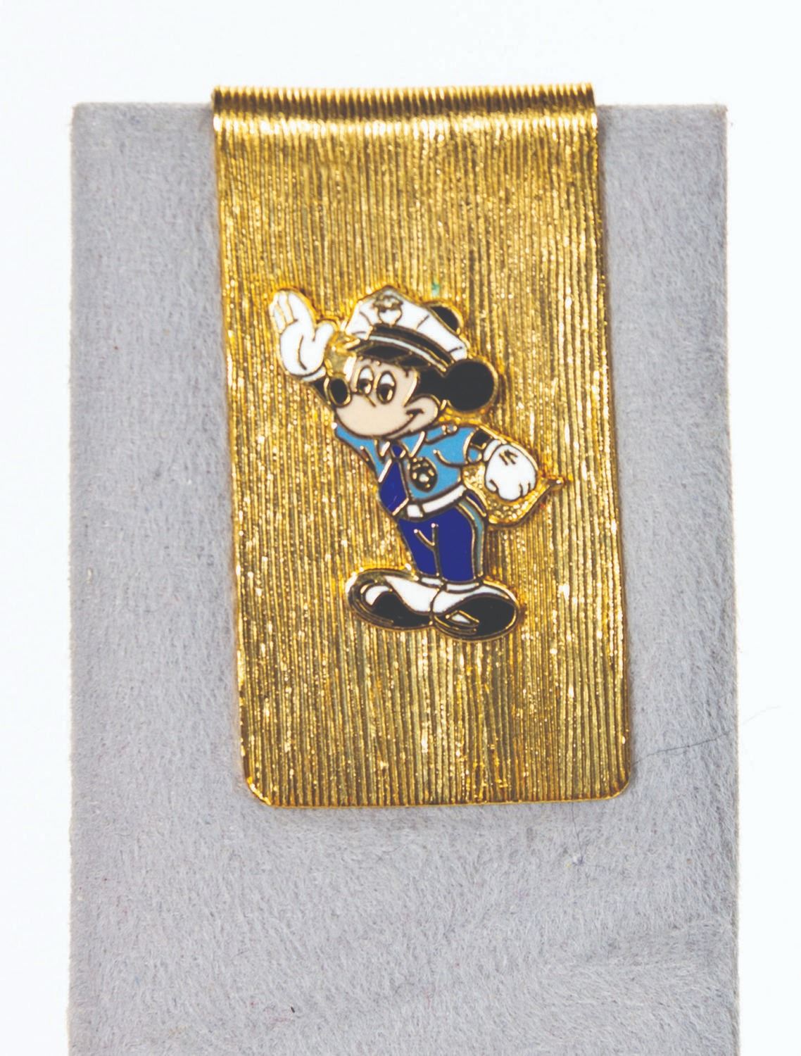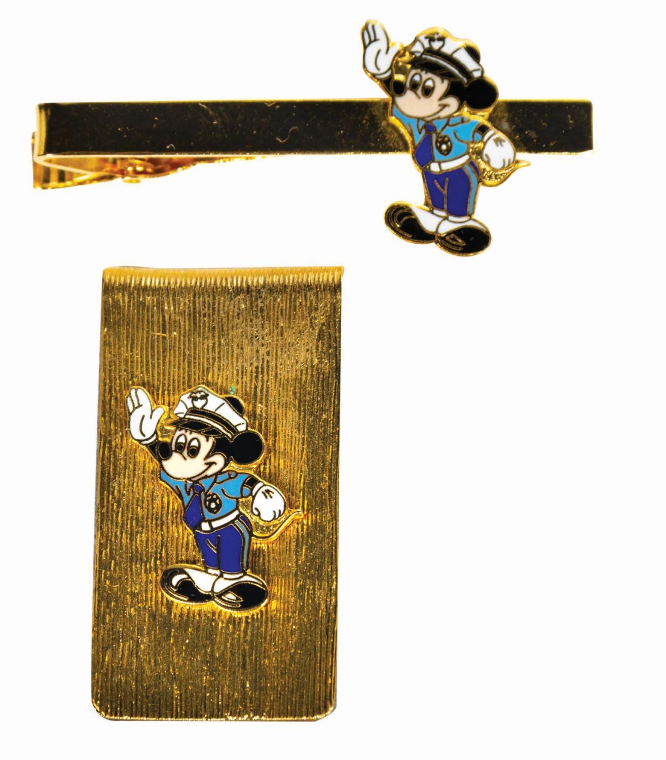 (Disneyland, c.1980s) A pair of Disneyland security guard men's accessories featuring enamel figures of Mickey Mouse in uniform. The set includes a gold-tone alligator clip tie bar and a ridged gold-tone metal money clip. The tie bar measures 2.25" long and the money clip is 2"x1". Both are in fine condition with minimal wear.