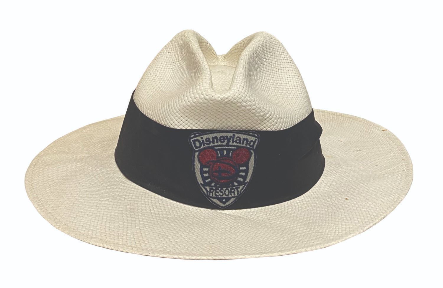 (Disneyland, c.2010s) A summer security officer hat from the Disneyland Resort. The wide-brimmed fedora-style hat features a black fabric hatband with an embroidered security patch. A size large, the hat is in good condition with minor creasing and wear from age. There is also a small hole on the back of the brim.