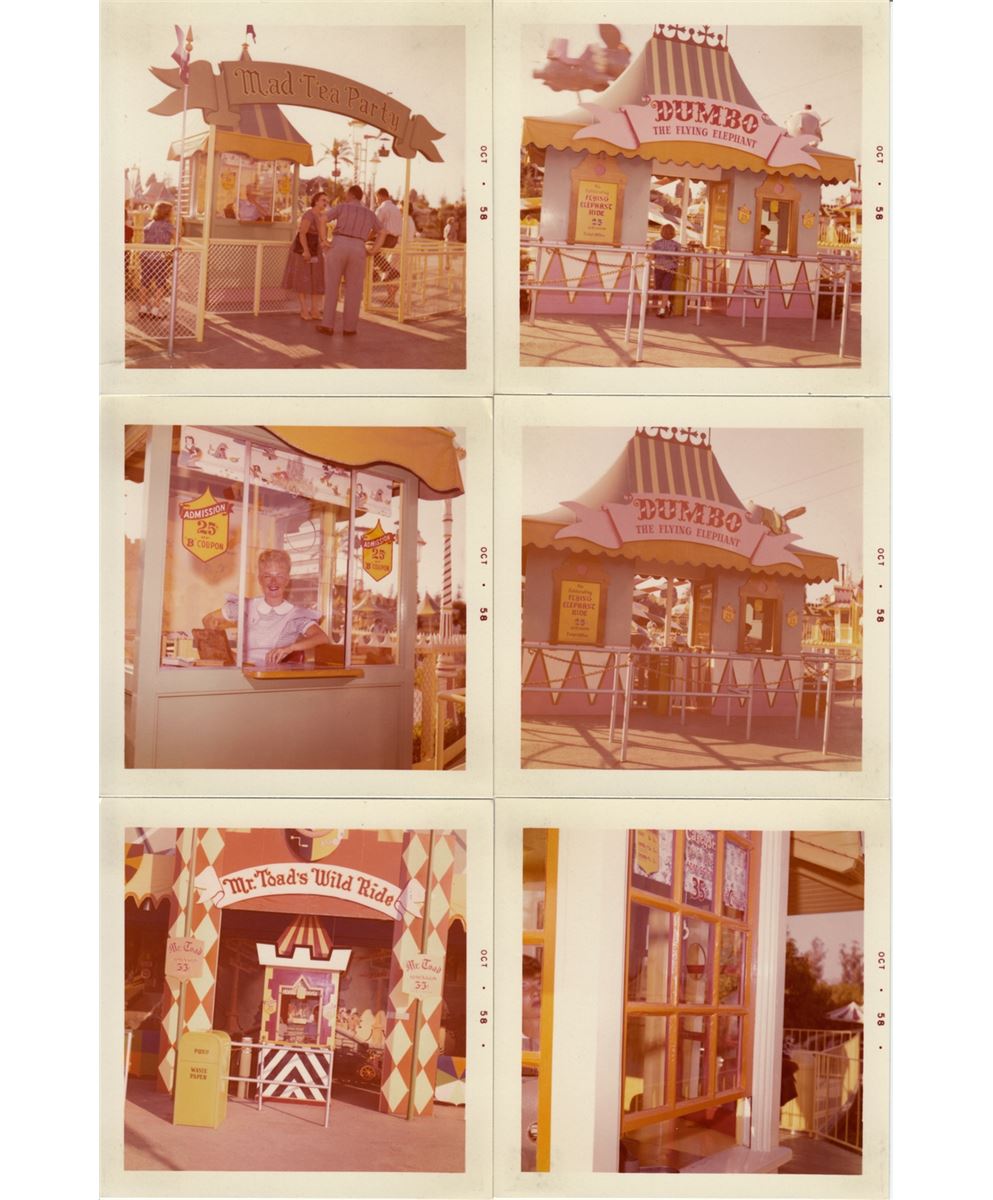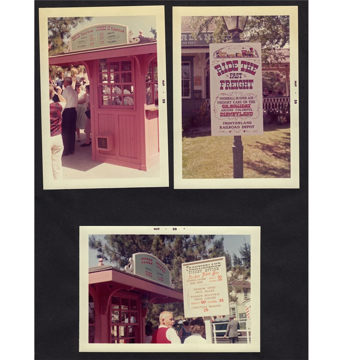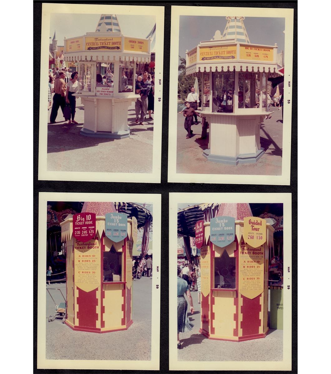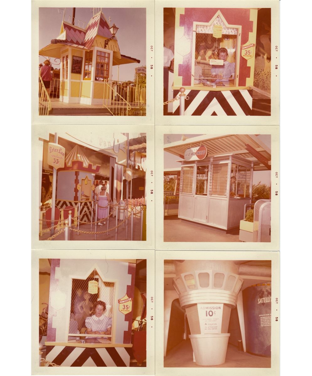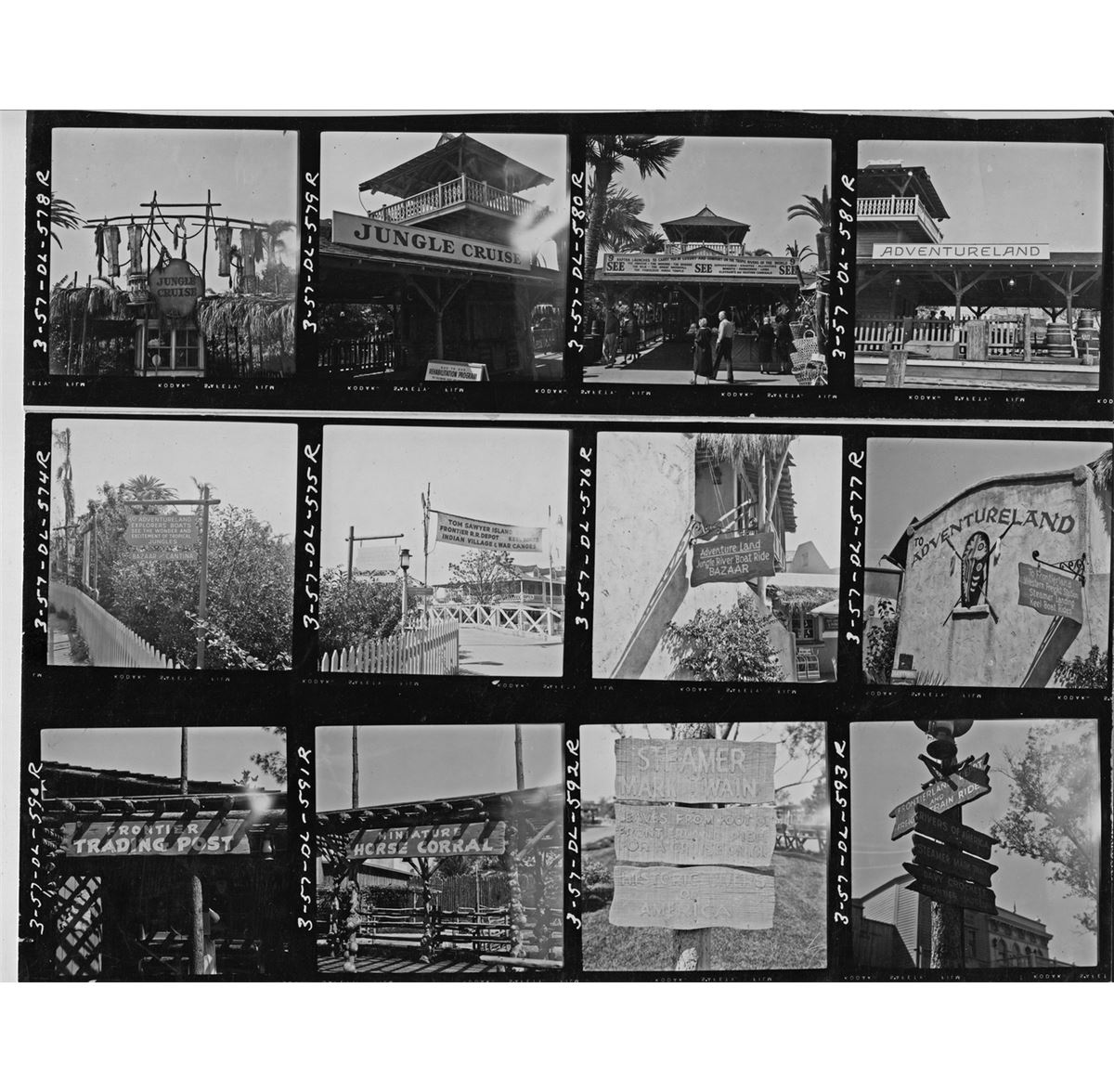 (Disneyland, 1950s-1970s) Incredible 1950s-1970s Disneyland Sign & Pictorial Dept. reference photo archive. For the casual collector or dedicated Disneyland scholar, here is an unprecedented historical photo archive directly from the original Disneyland Sign & Pictorial Department. Before digitally created imagery and computer inventory, the best way for the prolific DS&P department to archive their work was to literally, walk around the park and shoot photographs of recently completed projects. This way, the photo archive could be referenced when any type of signage needed to be replicated. Before Photoshop and the ink-jet printer’s use at the park, practically every single letter and image of posted signage at Disneyland was hand-rendered by absolute masters of the craft. Upon the initiation of the Disneyland project, Walt rounded up as many of the old movie studio masters who were quickly becoming extinct in Hollywood. He created a haven for these artisans with the park’s Sign & Pictorial Department. Once in place, Walt insisted this department install a mentorship program, where young apprentices would inherit the tricks of the trade. This insured the park would benefit, while an incredible artisan-trade would not wither and die. This absolutely stunning visual record of that department’s work in Disneyland’s ‘golden age’ is testament to the artistry of this division. The archive was handed down to the apprentice-turned-eventual supervisor of the department from his mentor. This personal record of the department’s work through the years shows detail after detail of rarely seen areas in Disneyland. Perhaps the occasional bit of rare signage or an elusive ticket booth might show up in the blurry background of a guest’s photo, but rarely are these details centered on as the object of focus. Amazing, rarely seen details throughout such as the ticket booths for the Viewliner and Space Station X-1, area directional signage, posted ticket denomination signs, the Main Gate ticket booths and rare attraction marquees. This collection (not all pictured), stands alone as an undeniable record of Disneyland’s high standards. Everything from directional signage to the Main Street credit window….restroom sign to exit sign…buckskin banners to works in progress are all represented. Black and white contact sheets to color snapshots and 8 x 10 prints make up the collection. A one of a kind collection, worthy of publication. The archive contains (60) 8 x 10 in. black and white prints, (1) 8 x 10 in. color print, (8) 8 x 10 in. black and white contact sheets, (1) 4 x 6 in. color print, (65) 3.5 x 5 in. color prints, and (48) 3.5 x 3.5 color prints. Collection is in fine condition.