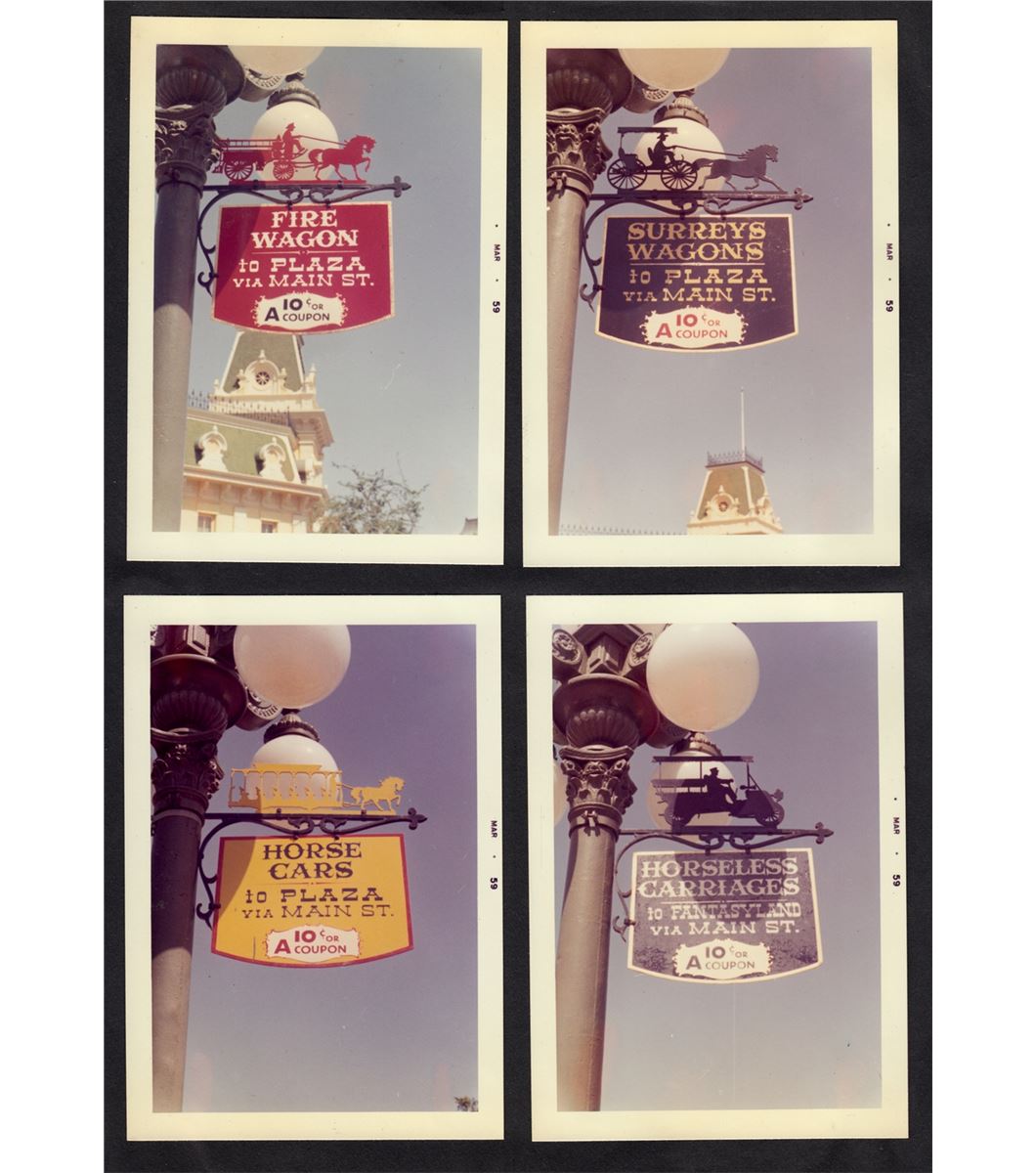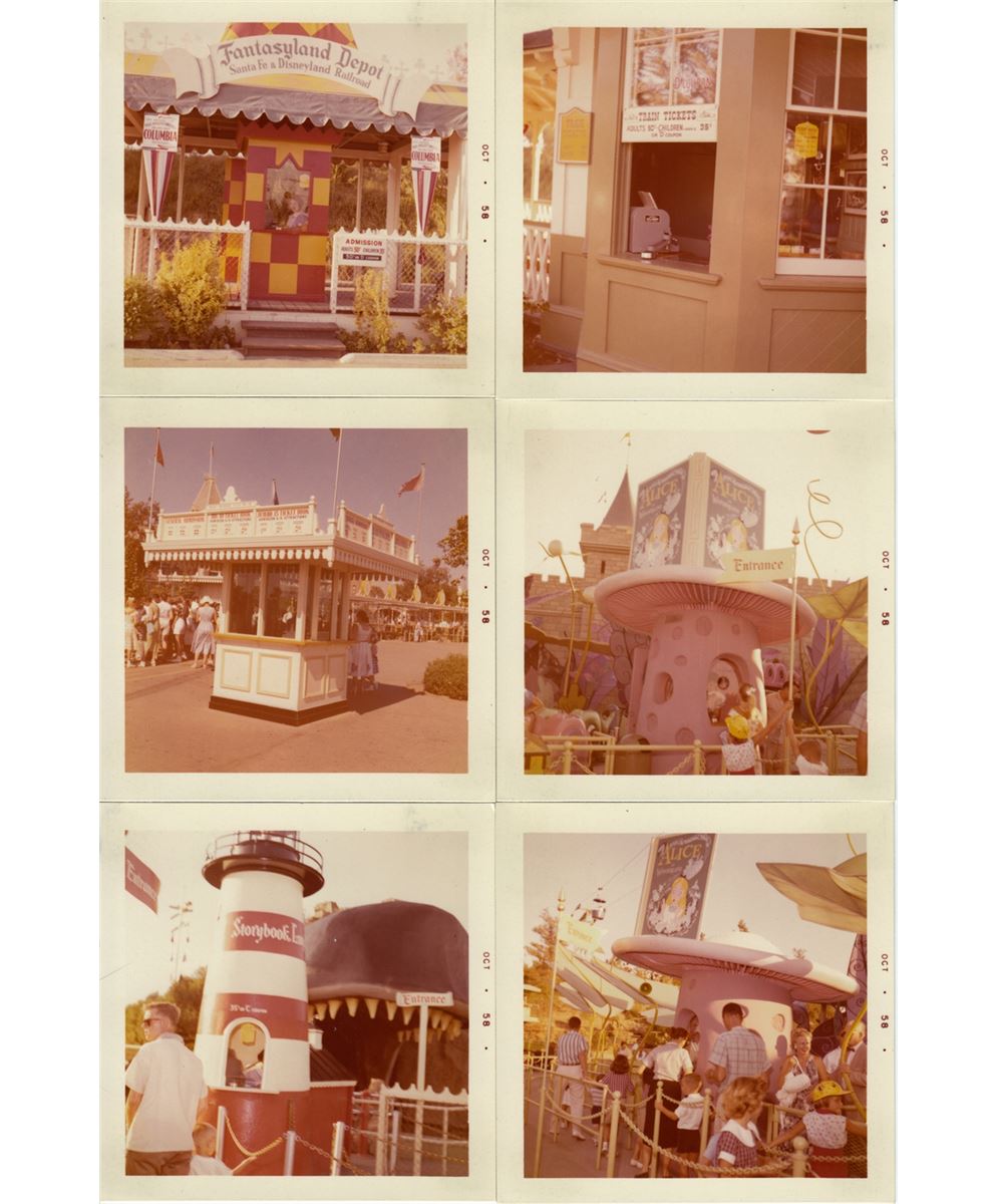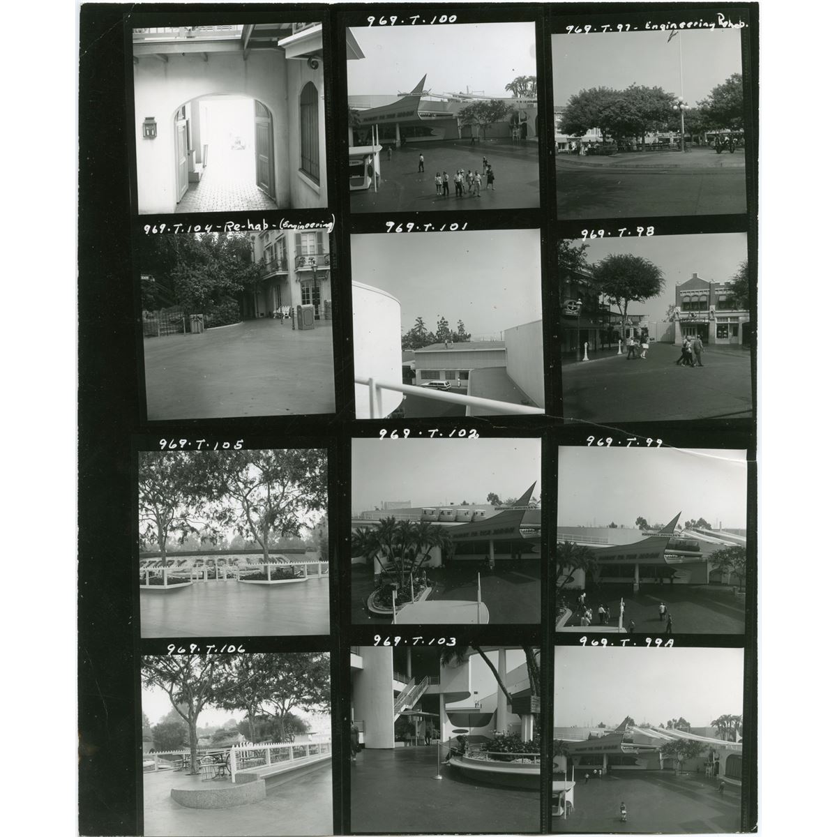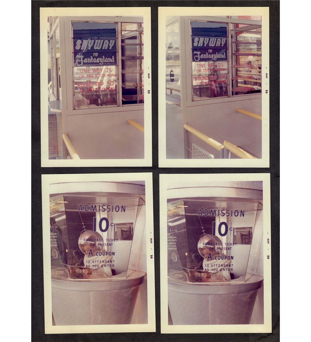 (Disneyland, 1950s-1970s) Incredible 1950s-1970s Disneyland Sign & Pictorial Dept. reference photo archive. For the casual collector or dedicated Disneyland scholar, here is an unprecedented historical photo archive directly from the original Disneyland Sign & Pictorial Department. Before digitally created imagery and computer inventory, the best way for the prolific DS&P department to archive their work was to literally, walk around the park and shoot photographs of recently completed projects. This way, the photo archive could be referenced when any type of signage needed to be replicated. Before Photoshop and the ink-jet printer’s use at the park, practically every single letter and image of posted signage at Disneyland was hand-rendered by absolute masters of the craft. Upon the initiation of the Disneyland project, Walt rounded up as many of the old movie studio masters who were quickly becoming extinct in Hollywood. He created a haven for these artisans with the park’s Sign & Pictorial Department. Once in place, Walt insisted this department install a mentorship program, where young apprentices would inherit the tricks of the trade. This insured the park would benefit, while an incredible artisan-trade would not wither and die. This absolutely stunning visual record of that department’s work in Disneyland’s ‘golden age’ is testament to the artistry of this division. The archive was handed down to the apprentice-turned-eventual supervisor of the department from his mentor. This personal record of the department’s work through the years shows detail after detail of rarely seen areas in Disneyland. Perhaps the occasional bit of rare signage or an elusive ticket booth might show up in the blurry background of a guest’s photo, but rarely are these details centered on as the object of focus. Amazing, rarely seen details throughout such as the ticket booths for the Viewliner and Space Station X-1, area directional signage, posted ticket denomination signs, the Main Gate ticket booths and rare attraction marquees. This collection (not all pictured), stands alone as an undeniable record of Disneyland’s high standards. Everything from directional signage to the Main Street credit window….restroom sign to exit sign…buckskin banners to works in progress are all represented. Black and white contact sheets to color snapshots and 8 x 10 prints make up the collection. A one of a kind collection, worthy of publication. The archive contains (60) 8 x 10 in. black and white prints, (1) 8 x 10 in. color print, (8) 8 x 10 in. black and white contact sheets, (1) 4 x 6 in. color print, (65) 3.5 x 5 in. color prints, and (48) 3.5 x 3.5 color prints. Collection is in fine condition.