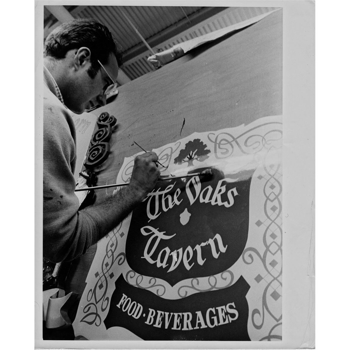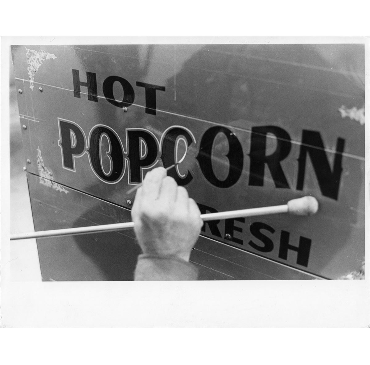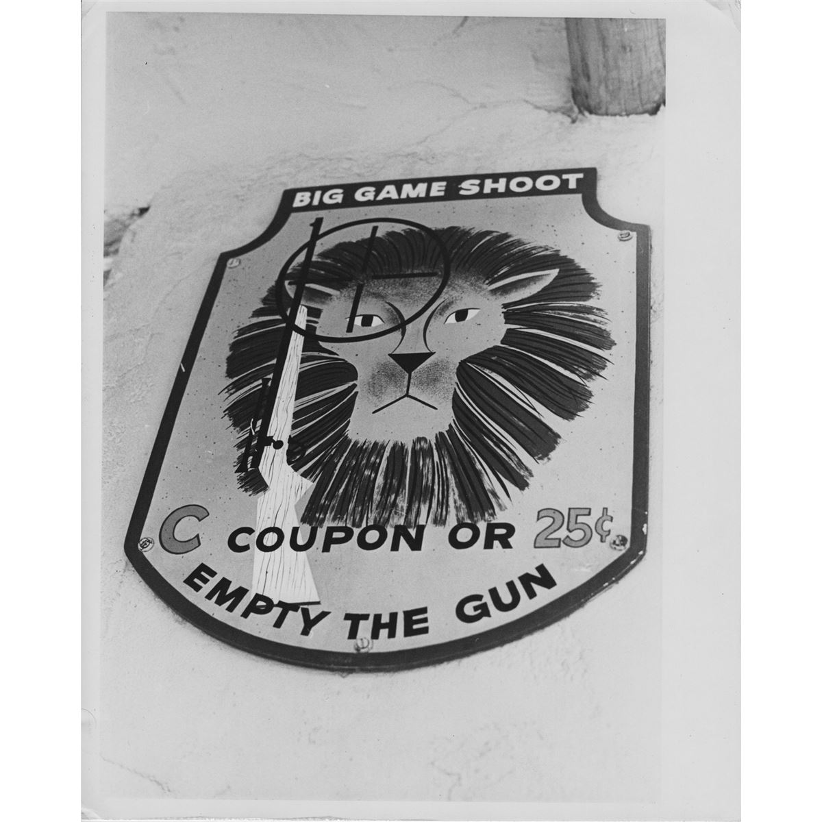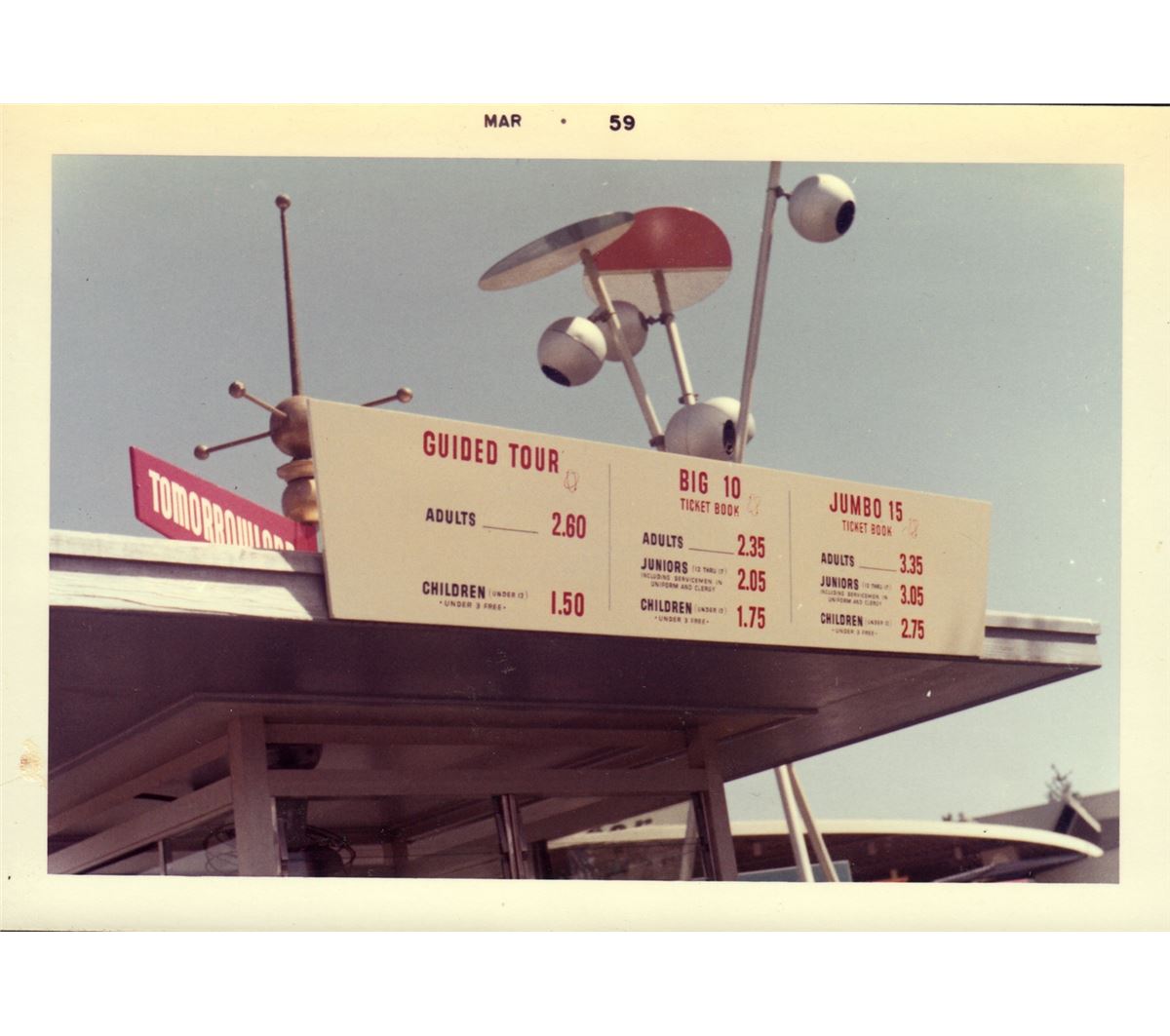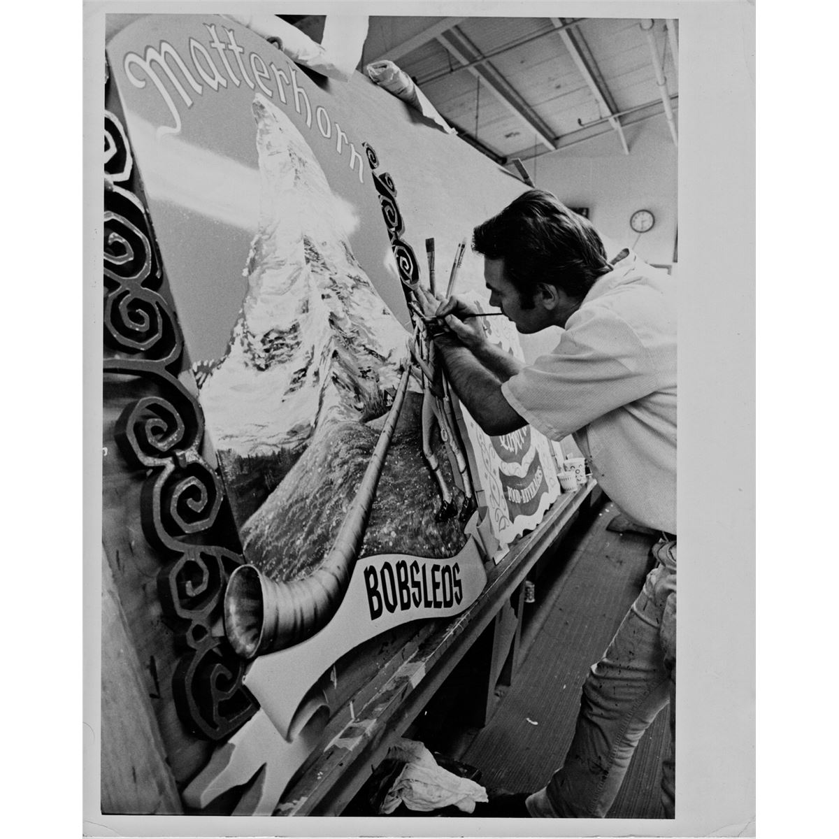 (Disneyland, 1950s-1970s) Incredible 1950s-1970s Disneyland Sign & Pictorial Dept. reference photo archive. For the casual collector or dedicated Disneyland scholar, here is an unprecedented historical photo archive directly from the original Disneyland Sign & Pictorial Department. Before digitally created imagery and computer inventory, the best way for the prolific DS&P department to archive their work was to literally, walk around the park and shoot photographs of recently completed projects. This way, the photo archive could be referenced when any type of signage needed to be replicated. Before Photoshop and the ink-jet printer’s use at the park, practically every single letter and image of posted signage at Disneyland was hand-rendered by absolute masters of the craft. Upon the initiation of the Disneyland project, Walt rounded up as many of the old movie studio masters who were quickly becoming extinct in Hollywood. He created a haven for these artisans with the park’s Sign & Pictorial Department. Once in place, Walt insisted this department install a mentorship program, where young apprentices would inherit the tricks of the trade. This insured the park would benefit, while an incredible artisan-trade would not wither and die. This absolutely stunning visual record of that department’s work in Disneyland’s ‘golden age’ is testament to the artistry of this division. The archive was handed down to the apprentice-turned-eventual supervisor of the department from his mentor. This personal record of the department’s work through the years shows detail after detail of rarely seen areas in Disneyland. Perhaps the occasional bit of rare signage or an elusive ticket booth might show up in the blurry background of a guest’s photo, but rarely are these details centered on as the object of focus. Amazing, rarely seen details throughout such as the ticket booths for the Viewliner and Space Station X-1, area directional signage, posted ticket denomination signs, the Main Gate ticket booths and rare attraction marquees. This collection (not all pictured), stands alone as an undeniable record of Disneyland’s high standards. Everything from directional signage to the Main Street credit window….restroom sign to exit sign…buckskin banners to works in progress are all represented. Black and white contact sheets to color snapshots and 8 x 10 prints make up the collection. A one of a kind collection, worthy of publication. The archive contains (60) 8 x 10 in. black and white prints, (1) 8 x 10 in. color print, (8) 8 x 10 in. black and white contact sheets, (1) 4 x 6 in. color print, (65) 3.5 x 5 in. color prints, and (48) 3.5 x 3.5 color prints. Collection is in fine condition.