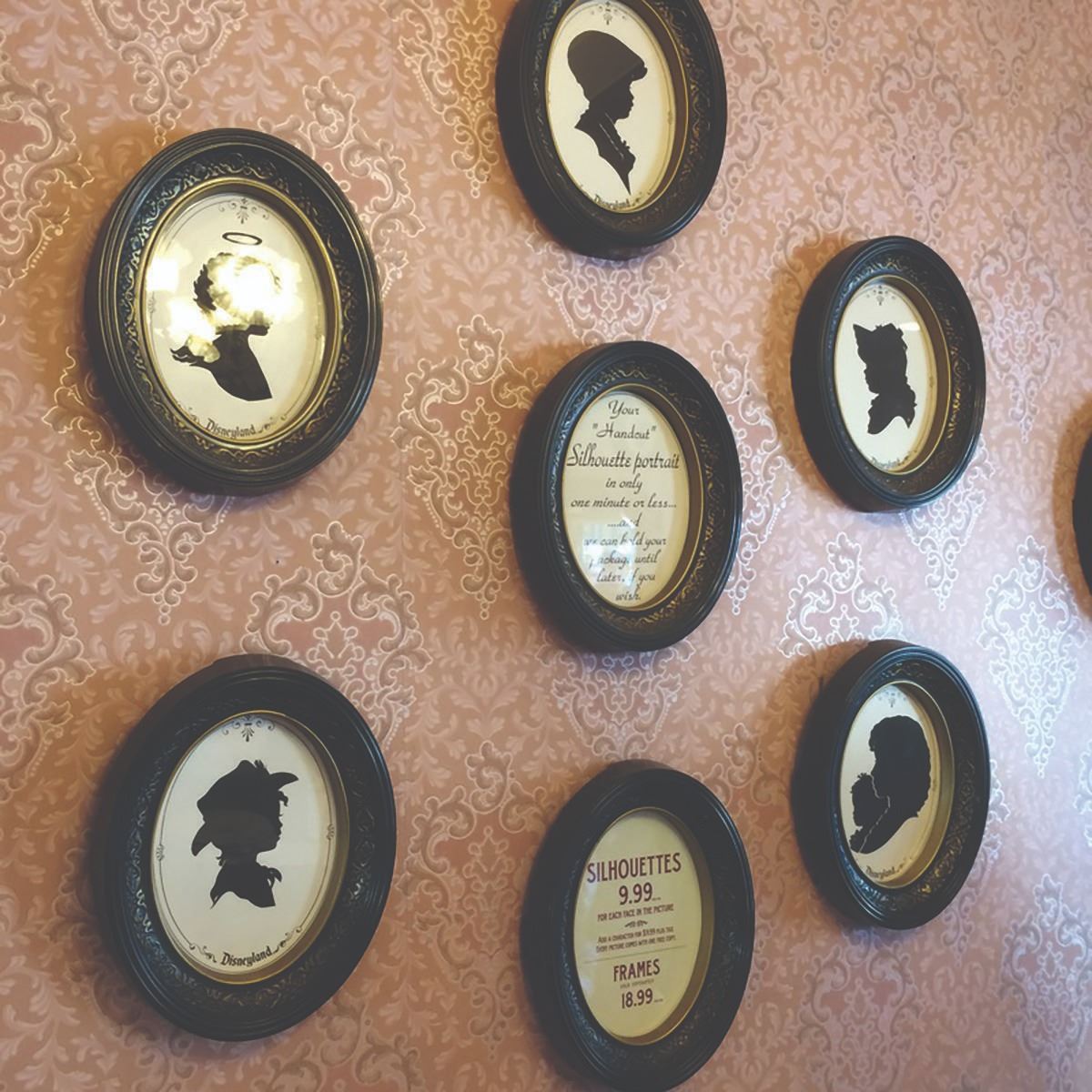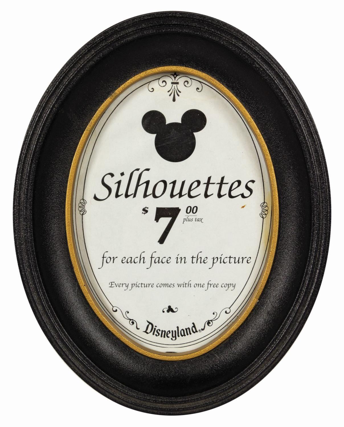 (Disneyland, c.2000s) A park-used picture frame sign for custom silhouette portraits which was displayed at the Silhouette Studio in Disneyland's Main Street, U.S.A. The molded plastic frame is expertly painted to appear as rich brown wood with gold-tone accents and features a printed advertisement under glass in the central oval opening. Measuring 9.5"x7.75" and 1.25" deep, the piece is in fine condition with minimal wear.