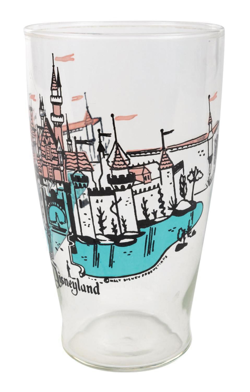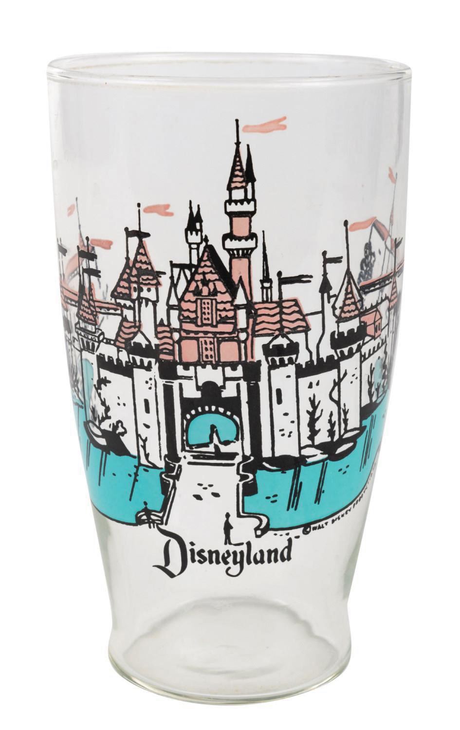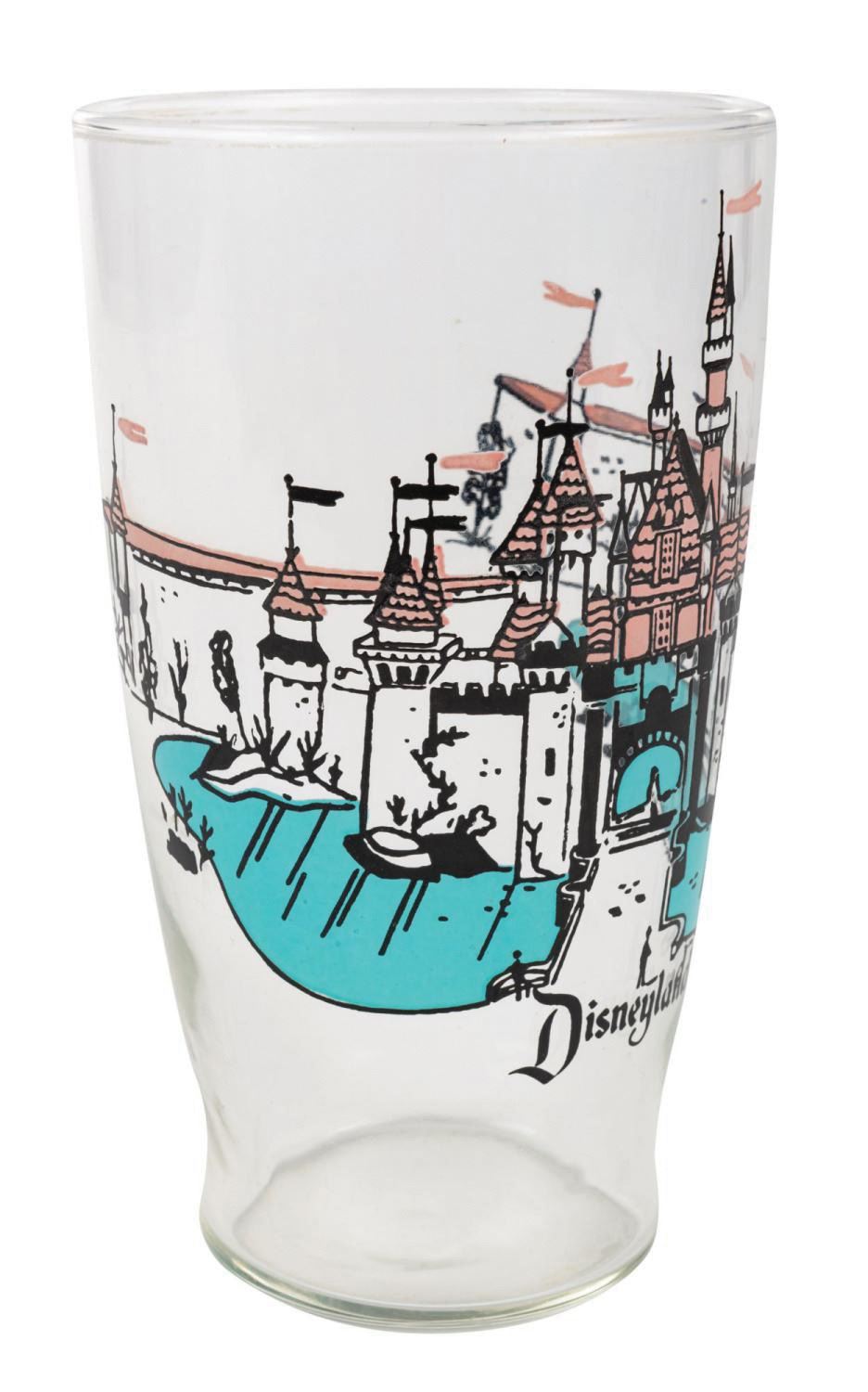 (Disneyland, c.1960s) A Sleeping Beauty Castle pint glass manufactured for Disneyland. The charming drinking glass features the iconic Park fixture and encompassing Swan Lake leading the way to the happiest land of them all. Measuring 7" tall and 4" in diameter, the pint glass is fine condition.