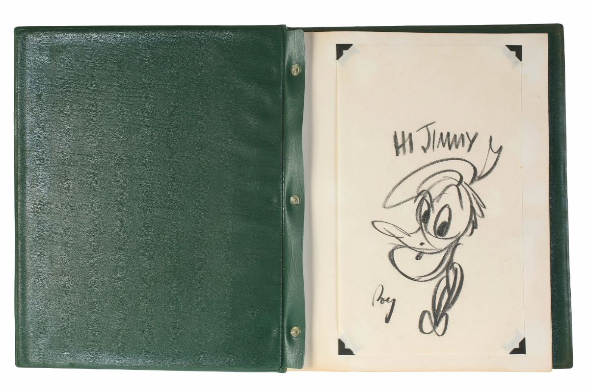 (Disneyland, 1950s) Green and gold souvenir book to fill with "words and pictures" of the different lands of the park. The first page has a drawing of Donald Duck by Roy Williams that reads, "Hi Jimmy". The remaining pages are blank, but have black tabs where photos can be placed. Book measures 11.25"x9.25". In good condition with some wear to the cover.