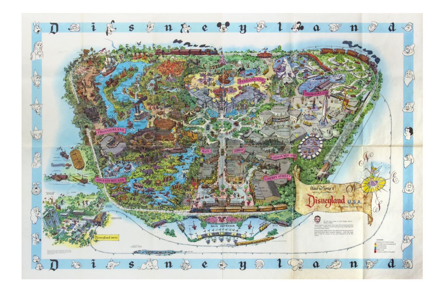 (Disneyland, 1962) This souvenir Disneyland map from 1962 features several new and planned attractions which first appear on this map, including the "Enchanted Tiki Room" and "Pirates of the Caribbean", both of which had yet to be completed. The map measures approximately 30"x45" and is in good condition with some wear to the fold-lines and edges, and minor handling wear from use.