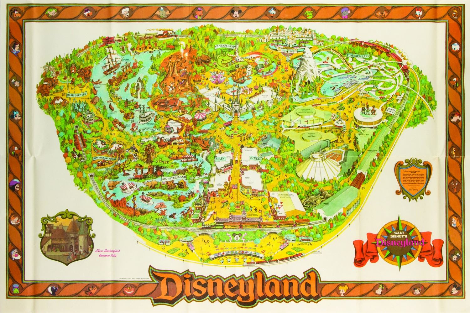 (Disneyland, 1982) A large souvenir map of Disneyland from 1982. This map features an advertisement for "New Fantasyland Summer 1983" in the lower left-hand corner and measures 29.5"x43.75". The condition is very good with some wear along the fold-lines and minor edge-wear.