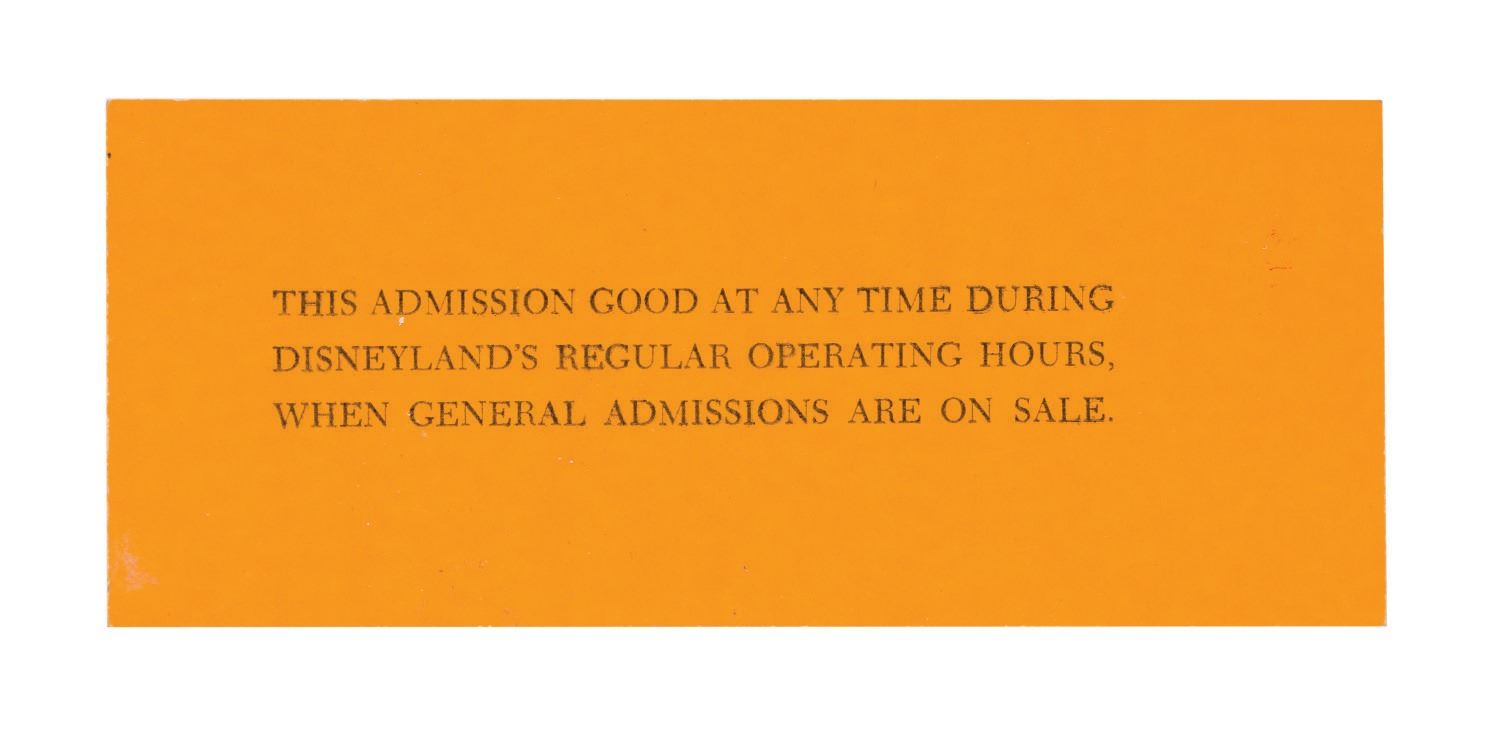 (Disneyland, 1960s) A Disneyland Complimentary Main Gate Admission from the 1960s. These tickets were usually given to cast members and studio employees to use as they wished. Measuring 2"x5", the ticket is in fine condition with light edge wear.