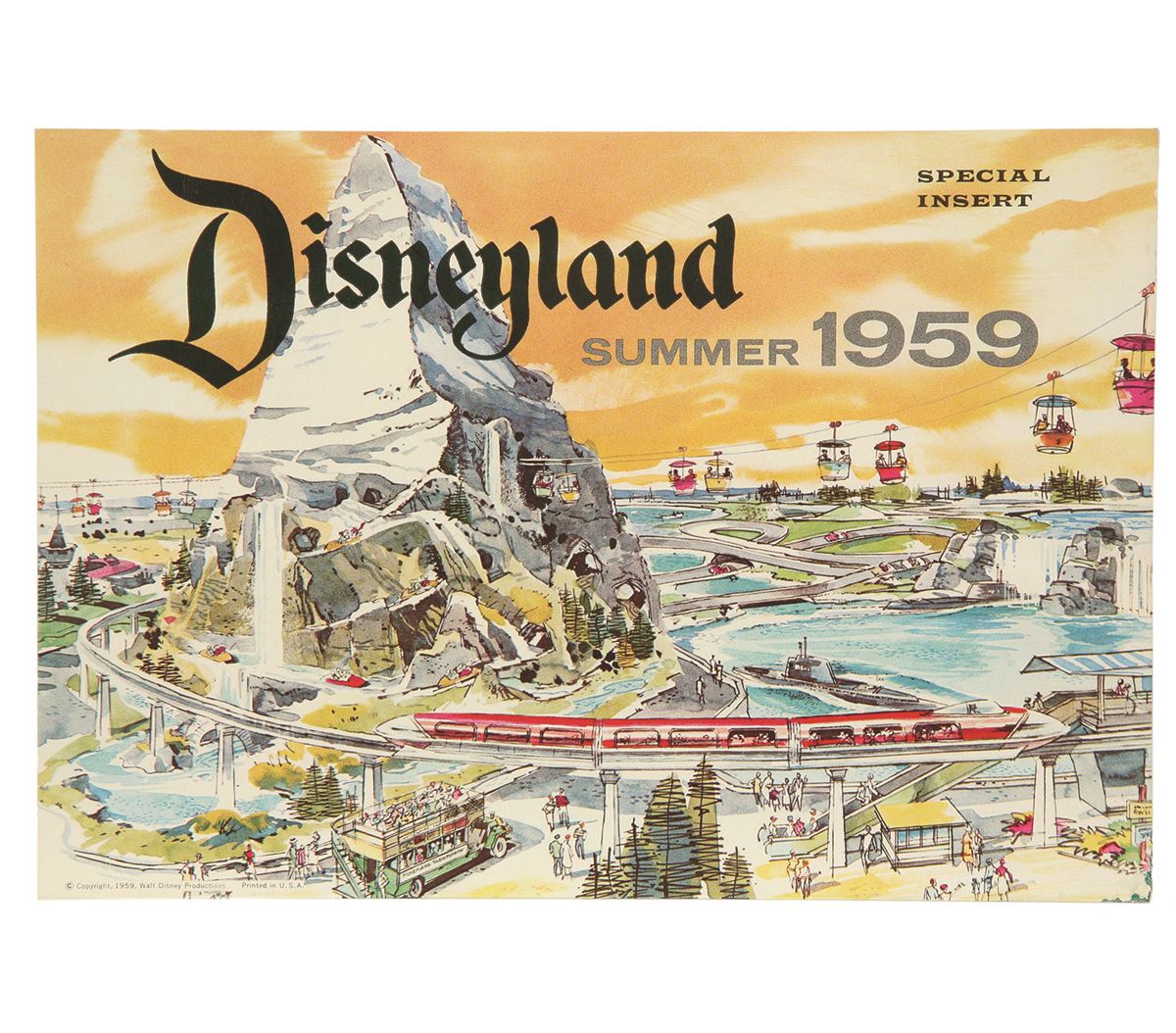 (Disneyland, 1959) Beautiful fold-out newspaper insert promoting the new attractions opening in the Summer of 1959 as part of Disneyland's "re-opening." The insert feature full-color concept artwork of the new rides. 11.5" x 8" folded and in fine condition with light wear.