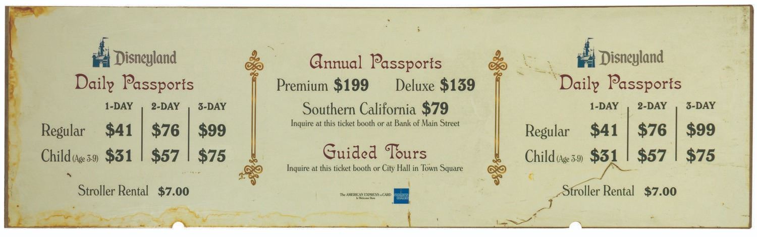 (Disneyland, c.2000) A double-sided ticket booth price sign from Disneyland. This large sign would have been displayed over the ticket windows, and has the daily passport prices at either end. The center portion of the sign highlights annual passports and guided tours. One side offers Premium, Deluxe, and Regular passports, while the reverse offers Premium, Deluxe, and Southern California passports. Printed and then adhered to a metal sheet, the sign measures 16.75"x56" and is in good used condition with surface wear consistent with outdoor park display. There is moderate scratching and scuffing to the surface, as well as staining around the edges. The tape covering the edges of the metal is worn away in places.