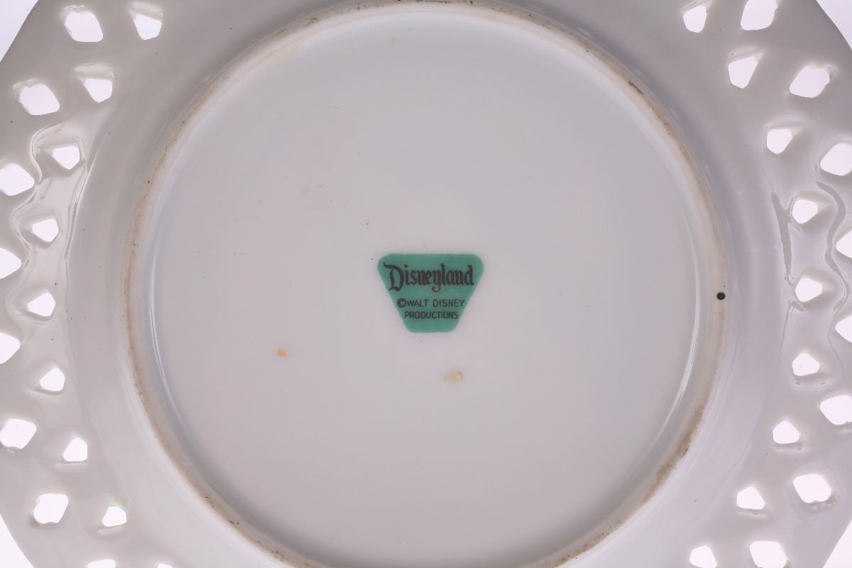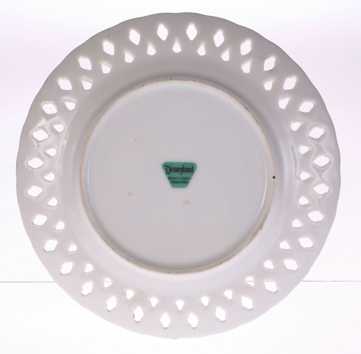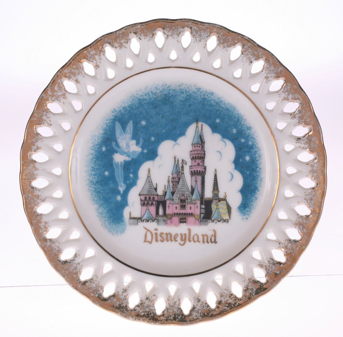 (Disneyland, 1950s) Ceramic lace plate with Tinker Bell and Sleeping Beauty Castle imagery in the center. Measures 6.25" in diameter and 0.75" tall. In good condition with minor wear to the base.