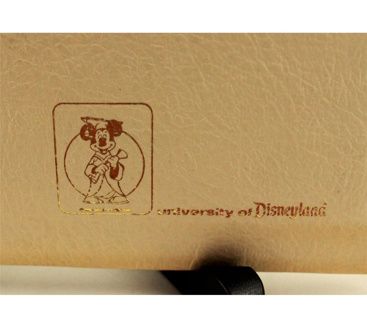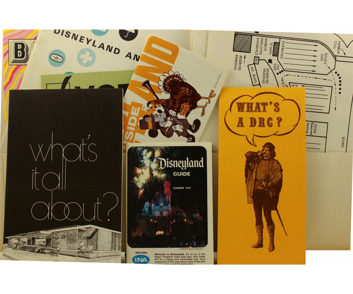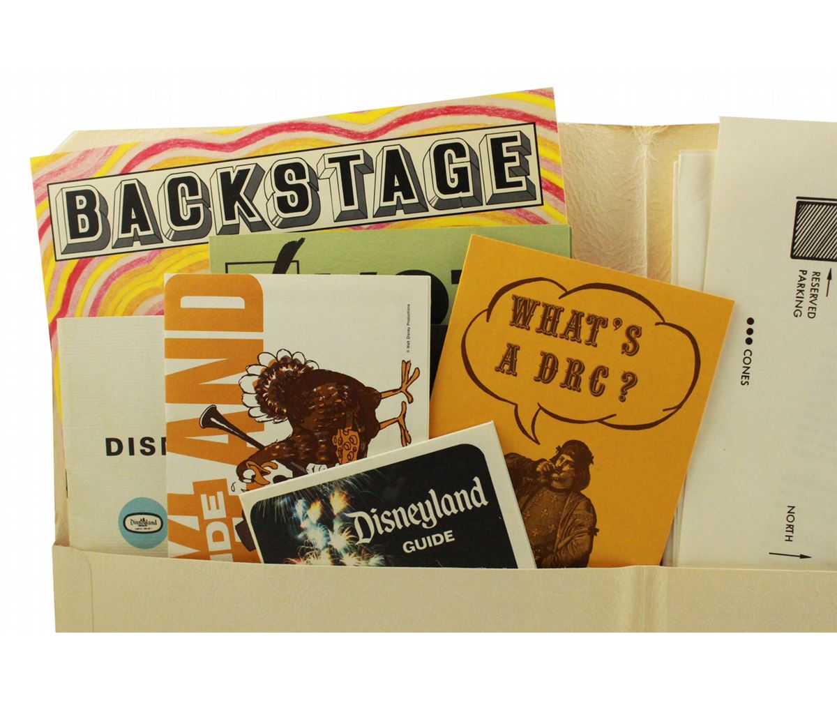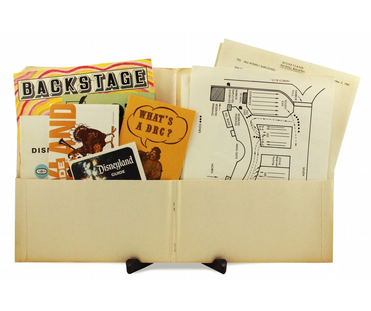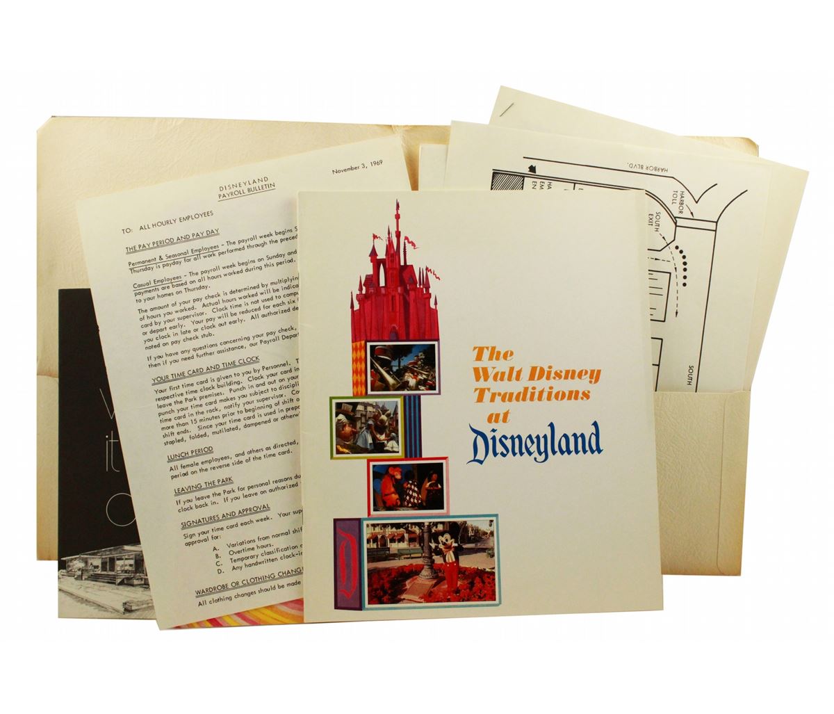 (Disneyland, 1970)An extremely rare, fully intact new hire cast member orientation packet from Disneyland University. The university, started by Van Arsdale France was incredibly thorough in its educational techniques and is credited for the highly admired “Disney Way” of handling guests. This large info pack is a testament to that fact. From the specific info sheets, appears to be for a food services employee. Consisting of a main folder, payroll info, employee entrance and parking maps, food service fact sheets, a Kitchen Safety orientation test, a Fire Safety orientation test, an accident avoidance sheet, a general company policy packet, a Disneyland and You booklet, a Summer 1970 BACKSTAGE DISNEYLAND magazine, a Summer 1970 Disneyland pocket guide, a Walt Disney Traditions at Disneyland booklet, an November 1970 Inside Disneyland newsletter, a Disneyland Recreational Club pamphlet, a Disneyland employee services info booklet on “The Center” and a voting info sheet on officers for the Disneyland Recreational Club for the latest elections. It is very rare to find an intact packet such as this and a fascinating look at how employees were handled in the late 60s-early 70s.All booklets are in excellent, unused condition and the white outer folder has only slight color from age. 11.75 x 9 in.