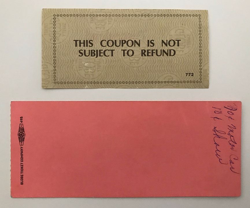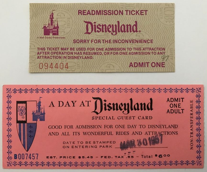 (Disneyland, c. 1950's-60's). A vintage 1957 Disneyland "Special Guest Card" ticket and a vintage Disneyland "Readmission Ticket." Both ticket are in good condition with normal wear from age and handling, including some writing on the backside of the Special Guest Card ticket, but this writing can't be readily seen on the frontside. Item comes with a Grand Circle Tour Auctions COA.