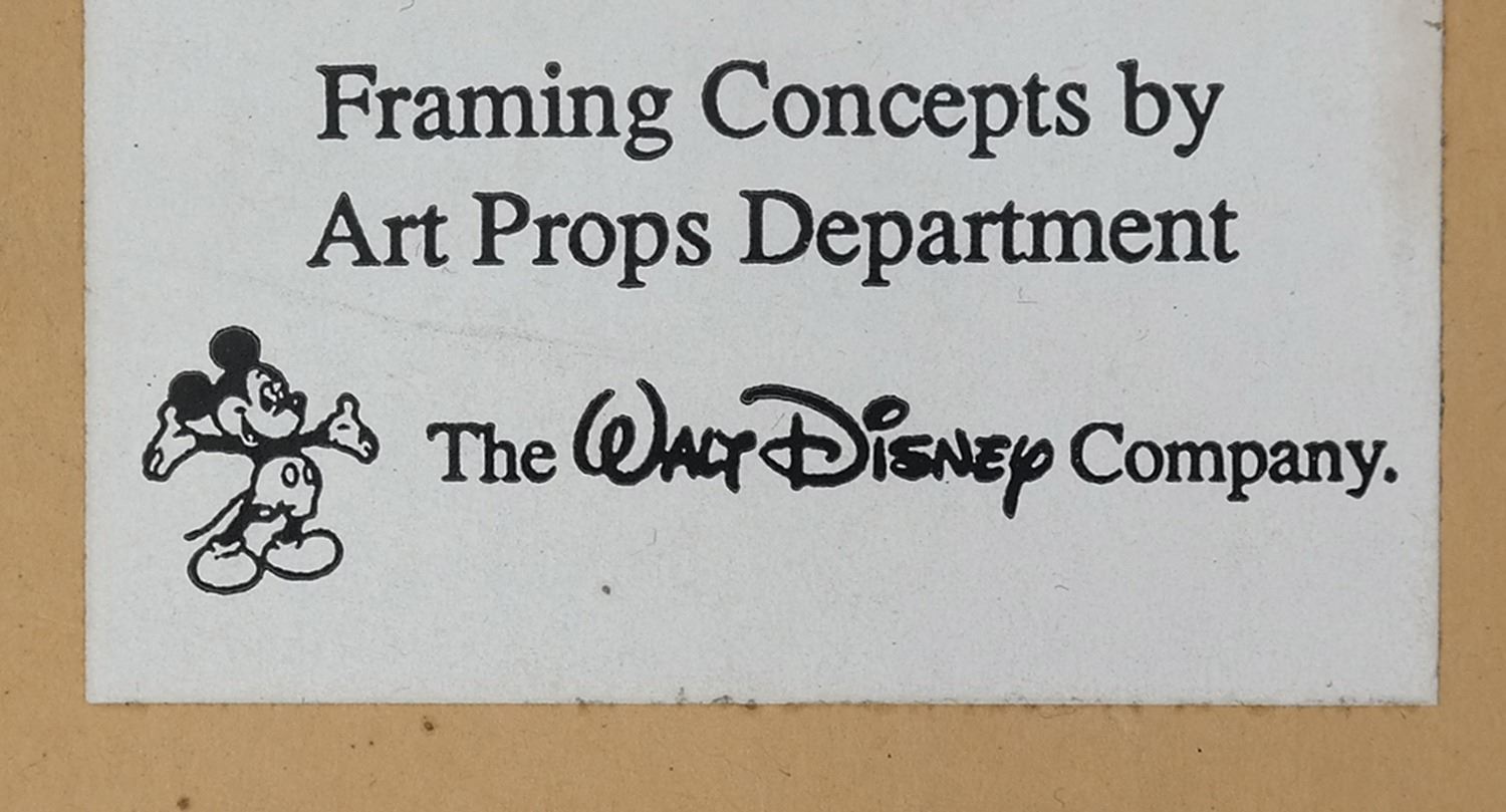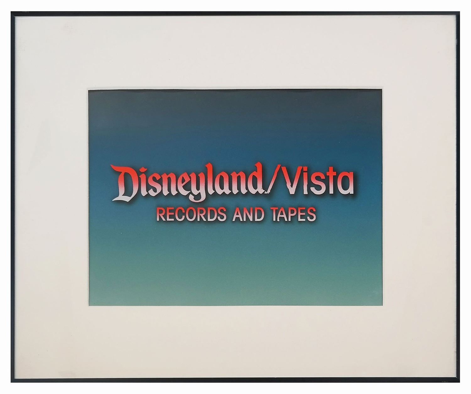 (Disneyland, 1980s) A one-of-a-kind title cel and hand-painted background created for the Disneyland/Vista record label. The cel set-up was likely used as a still image for promotional purposes, but was later displayed in its current frame within one of Disney's properties. The reverse of the frame has a Walt Disney Company art/props department label that identifies this piece as having been displayed in the "Tower" area. The background is hand airbrushed on art board, and the lettering is hand-applied on a cel layer. The title artwork has a viewable image size of 8"x11" within its 13.75"x17" frame, and is in fair condition overall with some paint wear in the forward slash and in the letters "V" and "I" in Vista. There is some wear to the frame from previous display.