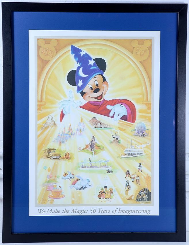 (Disneyland, Disney Gallery, c. 2002). A rare Disney lithograph "We Make the Magic: 50 Years of Imagineering" and signed by artist John Hench. In a limited edition size of 6000 (#996 of 6000), the lithograph shows Mickey Mouse in his Sorcerer's Apprentice role overseeing the magic of several park favorite attractions including Sleeping Beauty Castle, Mark Twain, Dumbo, Teacups, "it's a small world", Splash Mountain, Pirates of the Caribbean and more. The item measures approximately 34" x 26" and is in good condition with normal wear from age and minimal handling. Item comes with a Grand Circle Tour Auctions COA also includes the original Disney COA.