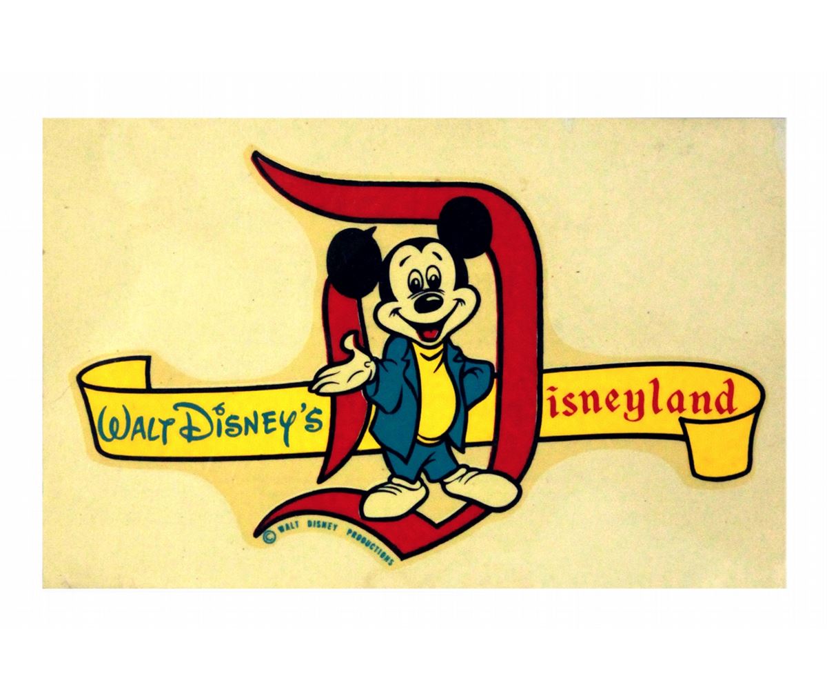 A decal from Disneyland, unused, with original instructions on how to apply the decal to your car or other glass. Not only did these pieces highlight fun colorful imagery for the park-goer, but it was just one of many examples of the success of Disneyland through it's merchandising and creating a brand. Items like these helped make people proud to show off that they went to Disneyland, and showed the changing mentality and effectiveness of Walt's branding. The decal is in great condition, and measures roughly 3"x5".