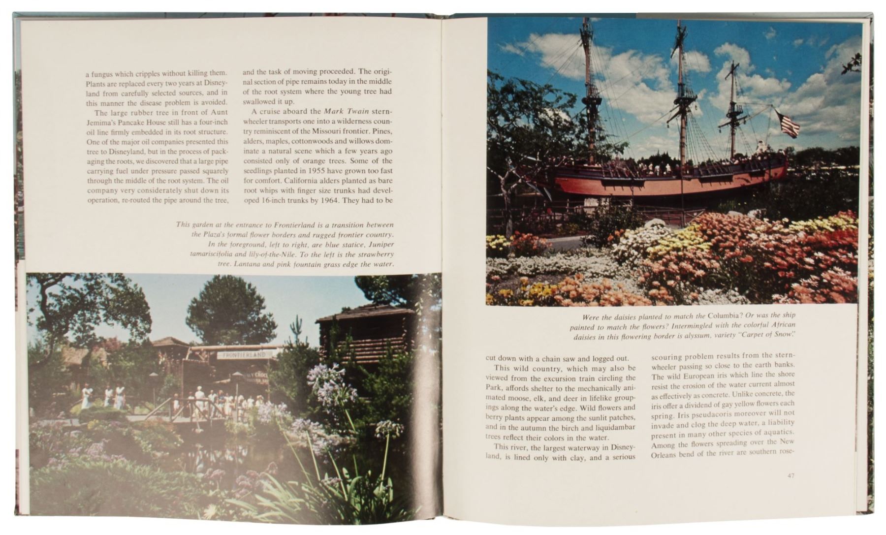 (Disneyland, 1965) A very rare "World of Flowers" hardcover souvenir book that was published and sold at Disneyland. This book was written by famed Disneyland horticulturist Morgan "Bill" Evans and is dedicated to his brother Jack Evans. This volume was only produced in 1965 and is very telling of how greatly Walt Disney respected the work of his lead Disneyland landscape architect. The book features terrific vintage photos with rare details of the park and its wide variety of plants. The book measures 11.25"x9.25" and is in good condition with some cover wear, including some splitting along the spine.