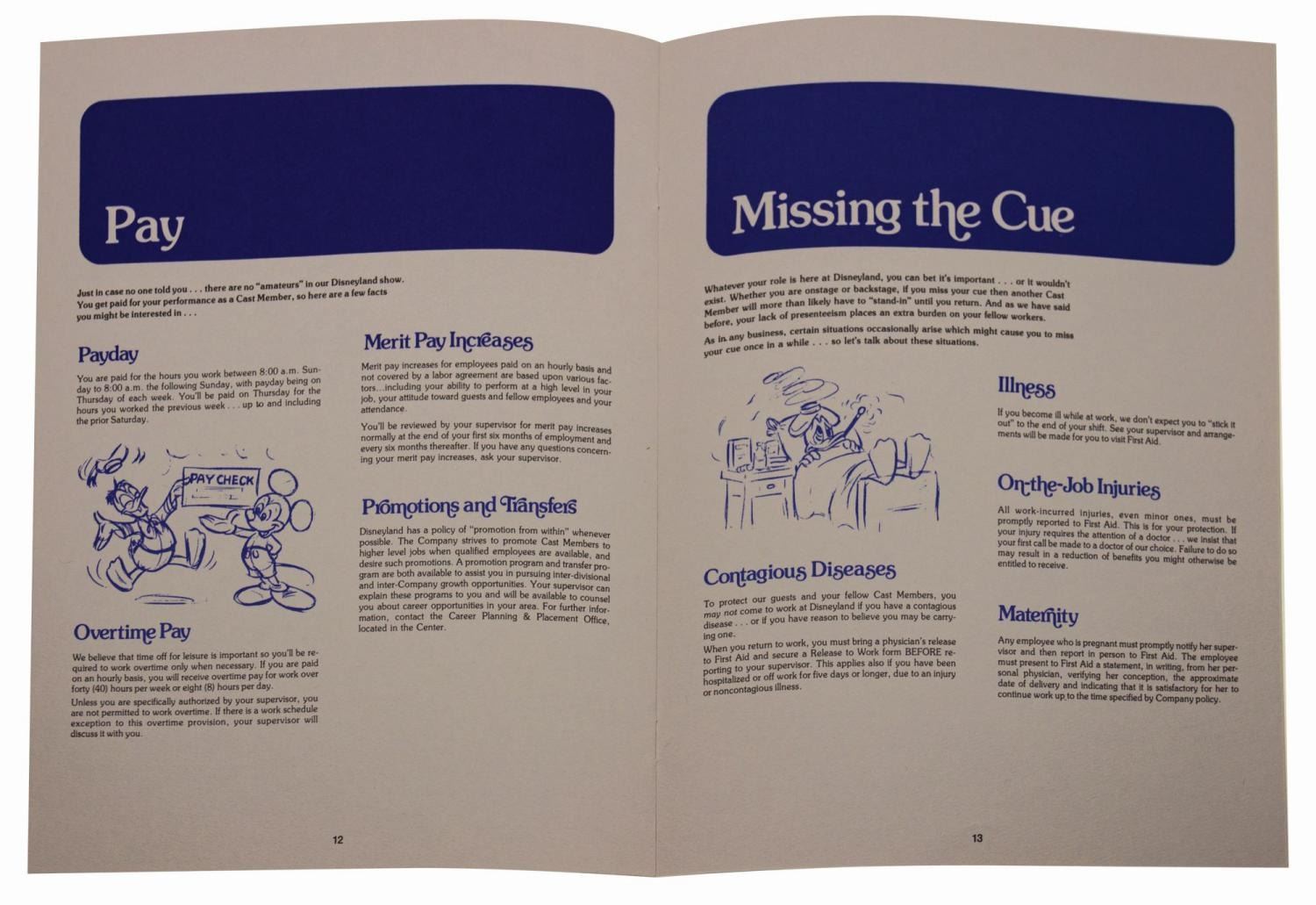 (Disneyland, 1982) An orientation booklet issued to new cast members titled Disneyland & You. The staple-bound 20-page guide introduces new hires to the Disney Way and addresses topics such as grooming standards, stage presence, company taboos, cast benefits, activities, and more. Measuring 11"x8.5", the booklet is in very good condition with only faint yellowing and minor wear to the covers.