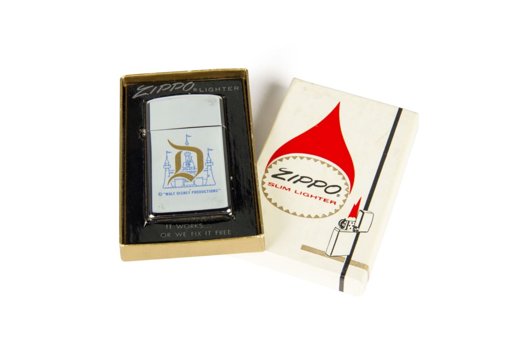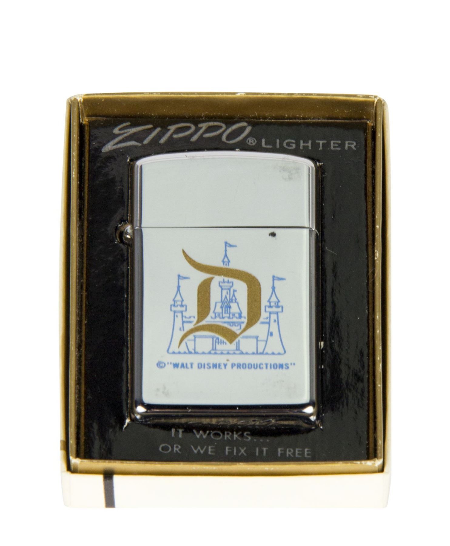(Disneyland, 1970s) A silver Disneyland Zippo slim lighter featuring a gold "D" on the front with imagery of Sleeping Beauty Castle behind it. The lighter comes in its original Zippo box, and the lighter measures 2.25"x1.25". The condition is very good with minor wear.