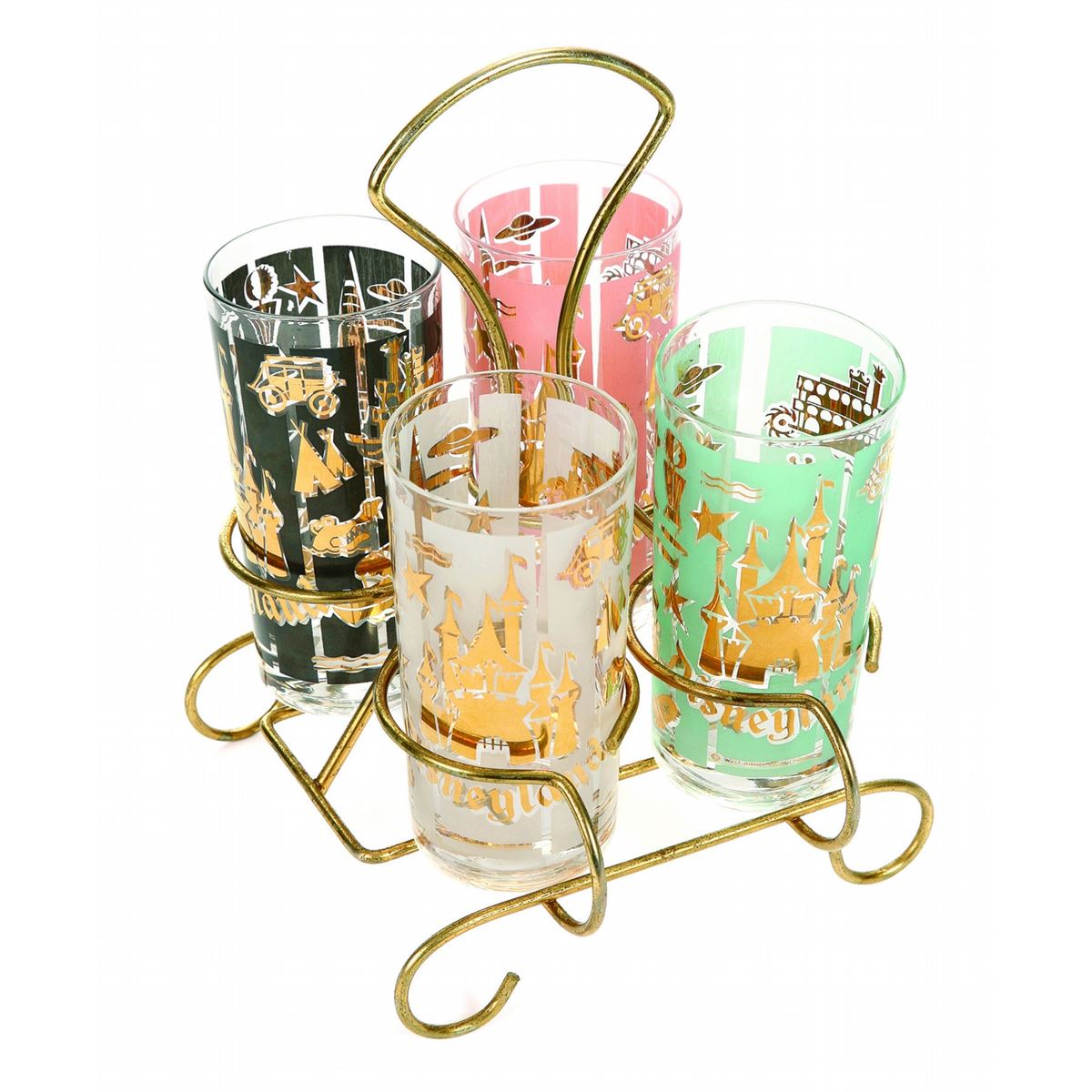 (Disneyland, 1958) A charming drinking glass set of (4) with a stylish gold-colored glass holder. Glasses feature imagery from the various park attractions in a beautiful reflective gold that compliments the glass holder. All four glasses contain the same imagery, with different colored accents per each glass. They come in pink, teal, black, and frosted white. Each glass measures 2.75" in diameter and 5" tall. The holder measures 11" tall. This set is in very good condition, with minimal wear.