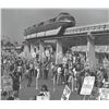 (Disneyland, 1984) A vintage picket sign from the historic 1984 Disneyland cast member strike. Workers walked off the job on September 24, 1984, after park management attempted to enact a two-year wage freeze and eliminate health benefits for part-time park employees. The strike finally ended after 22 days, when growing unrest compelled Disneyland management to agree to preserve part-time benefits, while the unions compromised on the wage freeze. The double-sided printed cardboard sign is stapled to a wooden handle and measures 42"x14". It is in good condition, exhibiting some minor darkening from age and handling war.