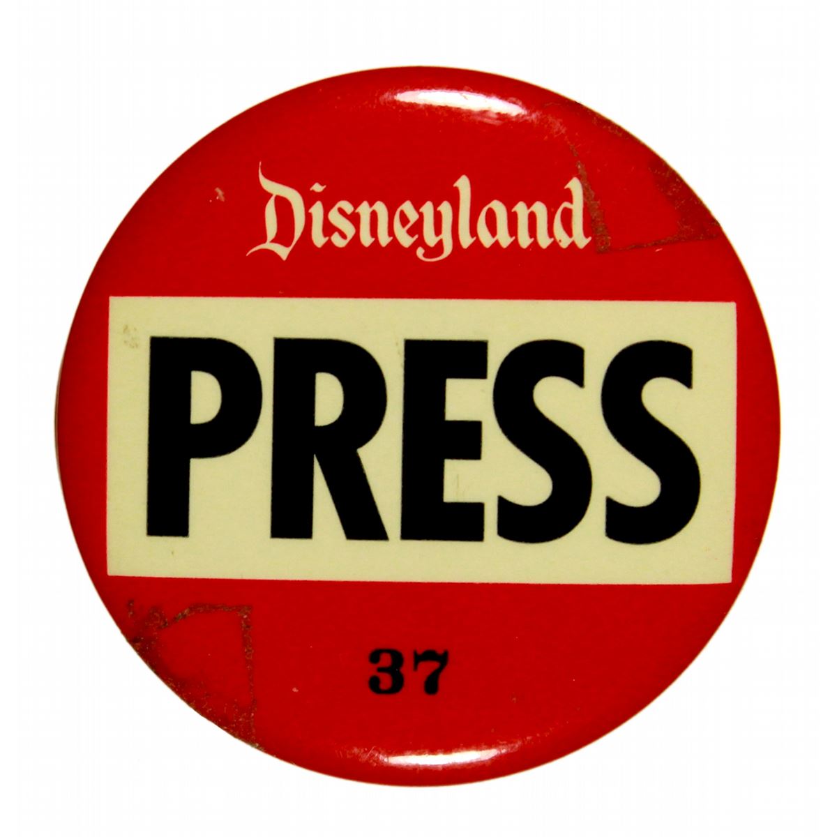 (Disneyland, 1958) Large pin back badge issued as part of the backstage credentials for members of the press for special events and other assignments. Measuring 3.5 in. in diameter. In fine condition.