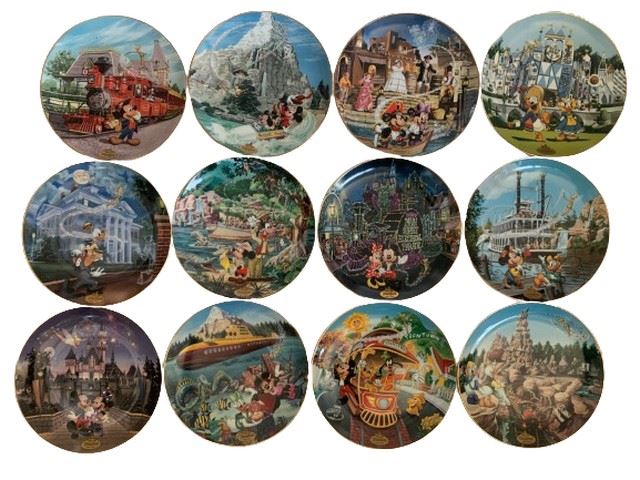 A collection of 12 collectible plates from Disneyland‘s 40th anniversary. Each plate is numbered and comes with a certificate of authenticity. This collection features Disneylands 40th anniversary from the Bradford Exchange. The list of plates includes The premiere plate featuring Sleeping Beauty Castle, the second plate featuring Disneyland railroad, the third plate featuring It's a Small World, the fourth plate featuring Mickey’s Toon town, the fifth plate featuring Pirates of the Caribbean, the sixth plate featuring the Haunted Mansion, the seventh plate featuring Matterhorn, the eighth plate featuring Mark Twain Riverboat, the ninth plate featuring the Main Street electrical Parade, the 10th plate featuring Big Thunder Mountain Railroad, the 11th plate featuring Jungle Cruise, and the 12th plate featuring Submarine Voyage.