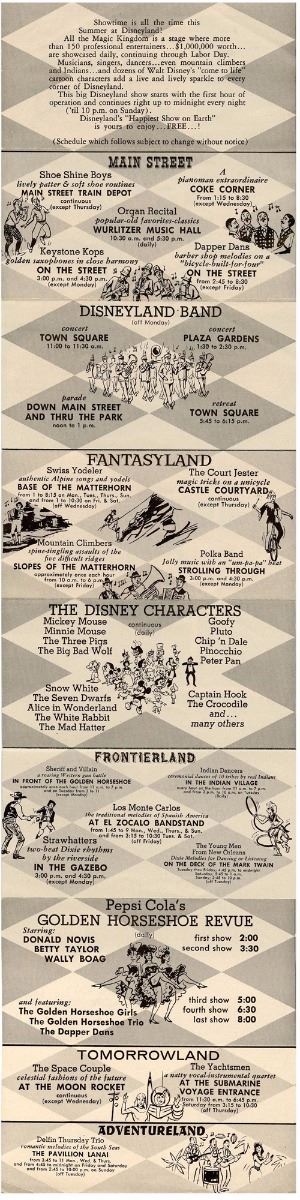 (Disneyland, 1959) Complimentary "Disneyland's Happiest Show on Earth Just For Fun" fold-out flyer. Contains illustrated information on the daily activities throughout the park. Measures 2.2"x4.25" folded, and opens to reveal 8 double-sided sections of information measuring 17"x4.25". In good condition.
