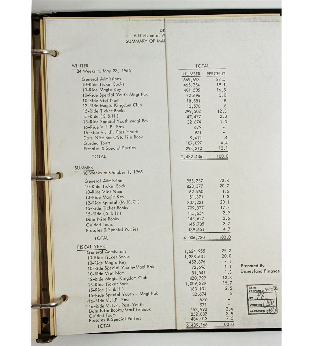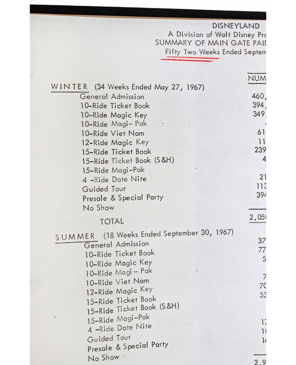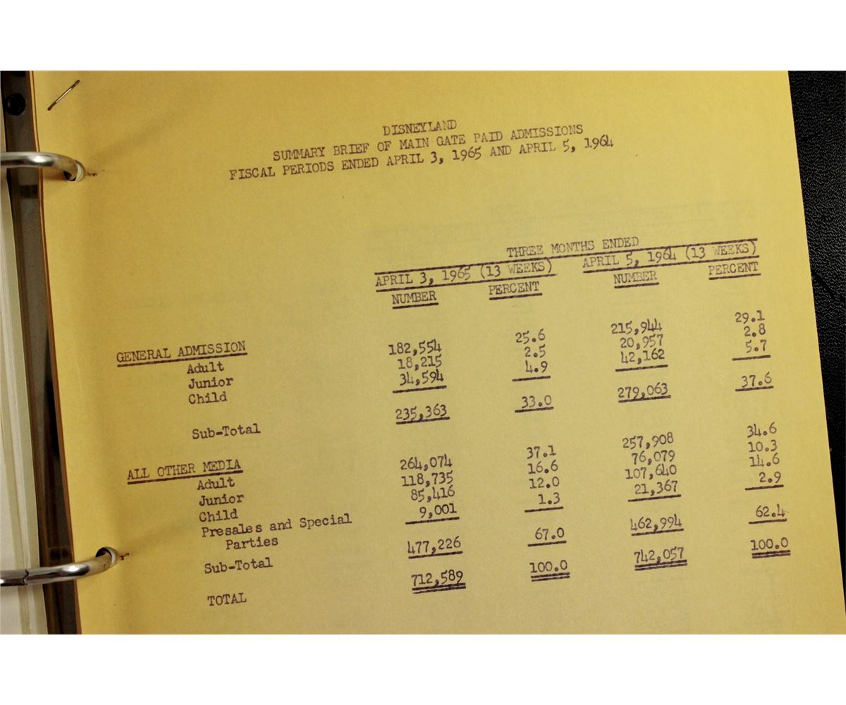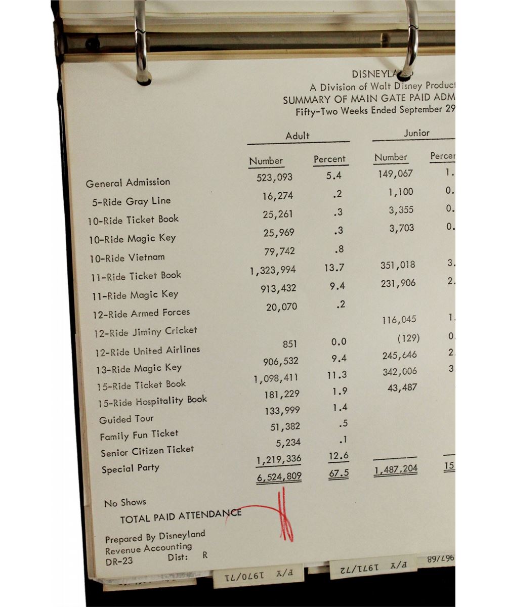 (Disneyland, 1975) Fascinating summary of ticket sales and admission stats for 1965-1975. Measures 11.5 x 10 in.