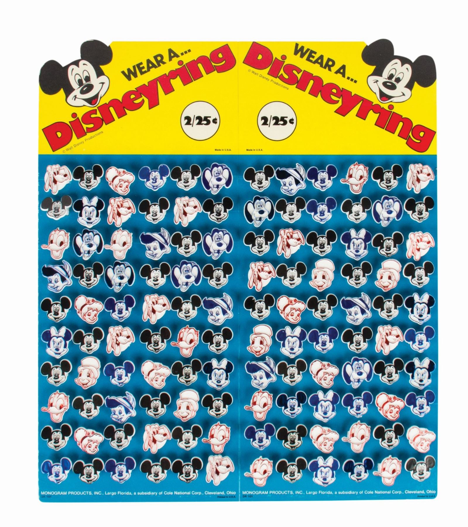 (Monogram Products, Inc., c.1950s-60s) A store display for "Disneyring" character rings depicting Mickey, Minnie, Donald, Pluto, Goofy, and Pinocchio. This display contains all 120 original plastic Disneyrings and measures 15.5"x13.5". The condition is very good.