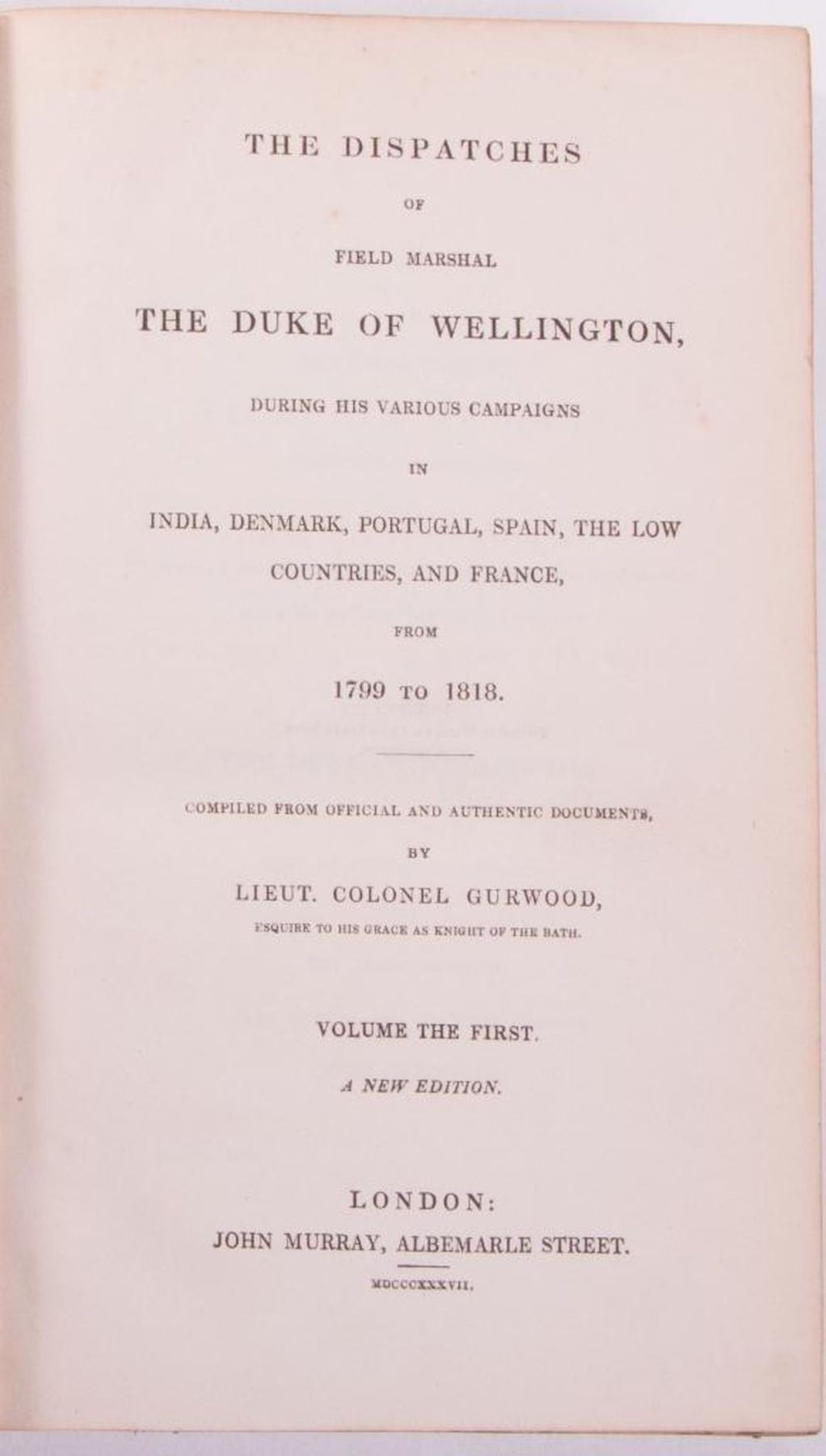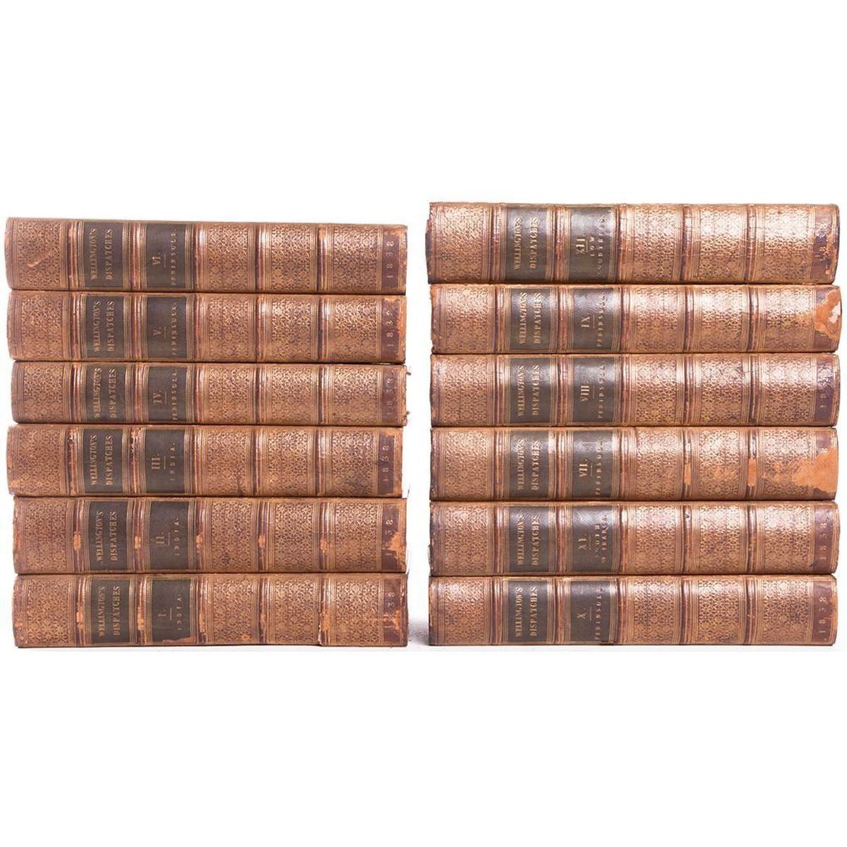 Title: The Dispatches of Field Marshal the Duke of Wellington, During his Various Campaigns in India, Denmark, Portugal, Spain, the Low Countries, and France, From 1799 to 1815 Author: Compiled by Lieut. Colonel Gurwood Place: London Publisher: John Murray Date: 1838 Description: Twelve volumes bound in a beautiful brown leather with gilt design on the spine. Green leather title and volume blocks with gilt letters. Marbled endpapers and matching page edges. First editions throughout. Attractive shelf appeal. Condition: Good-Very good. Leather rubbed off in some areas of spine. Slight foxing to endpapers.