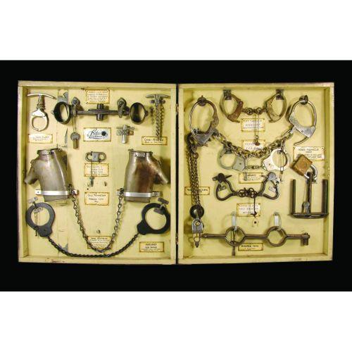 Display Box of 13 Handcuffs and Leg irons. Collected by Dr. Earl Lockman an early Californian Escape Artist. Including the famous Lilly Iron associated with Abraham Lincolns conspirators, a set of iron mittens, designed A.L. Elliot 1925 and a set Mattatuck handcuffs and leg irons. Various sizes and conditions, most come with keys.