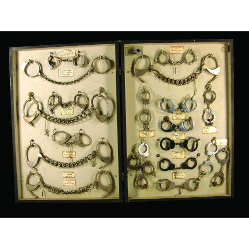 Display Box of over 20 Handcuffs and leg irons. Collected by Dr. Earl Lockman an early Californian Escape Artist. Includes a Pair of J.F. Carberry Handcuffs, Worchester, Mass. 1912. Various sizes and conditions, most come with keys.