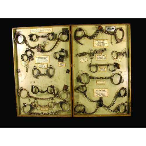 Display Box of over 18 Handcuffs, leg irons and thumb cuffs. Collected by Dr. Earl Lockman an early Californian Escape Artist. Includes Lilly leg irons and set of J.C. Palmer Handcuffs and Leg irons. Various sizes and conditions, most come with keys.
