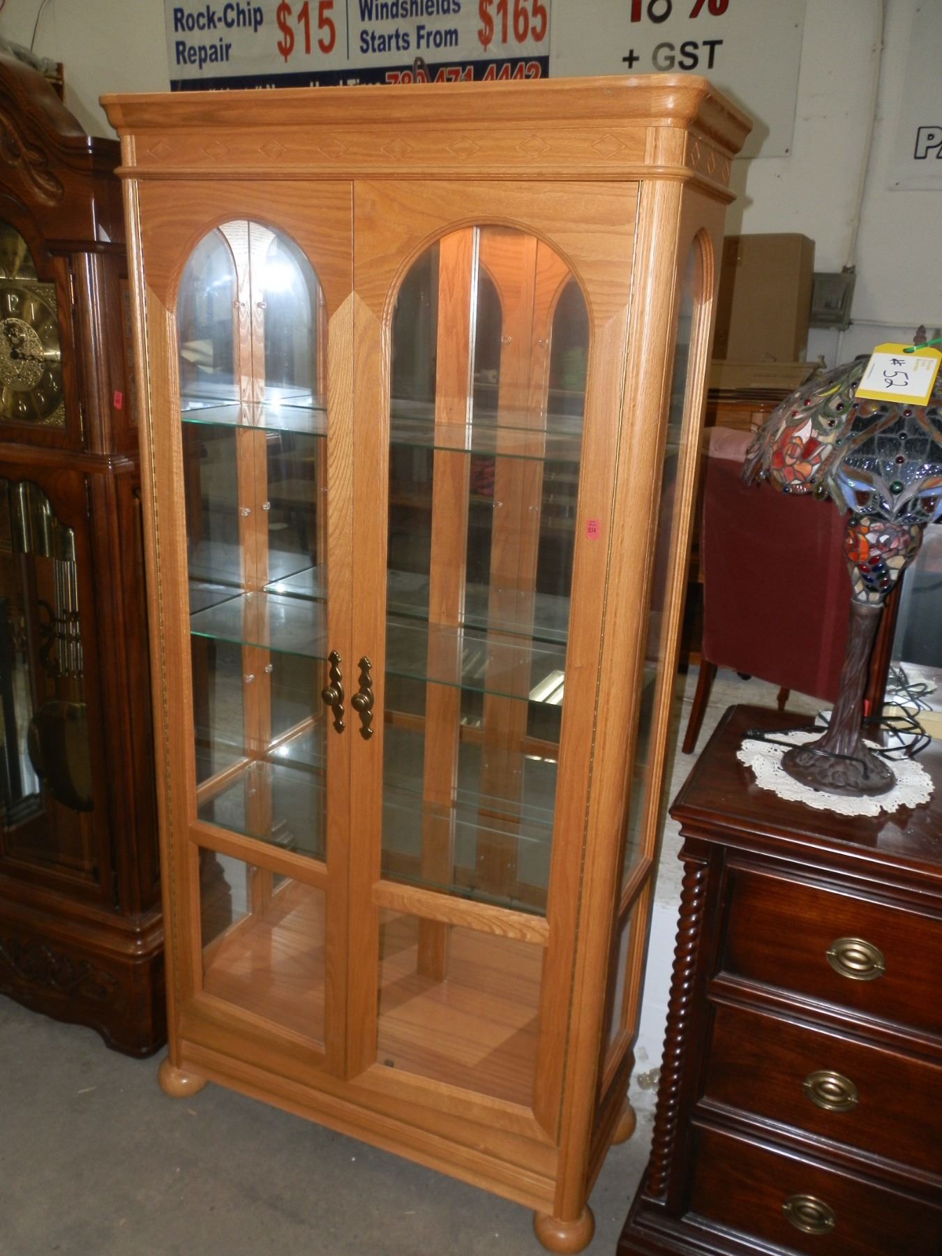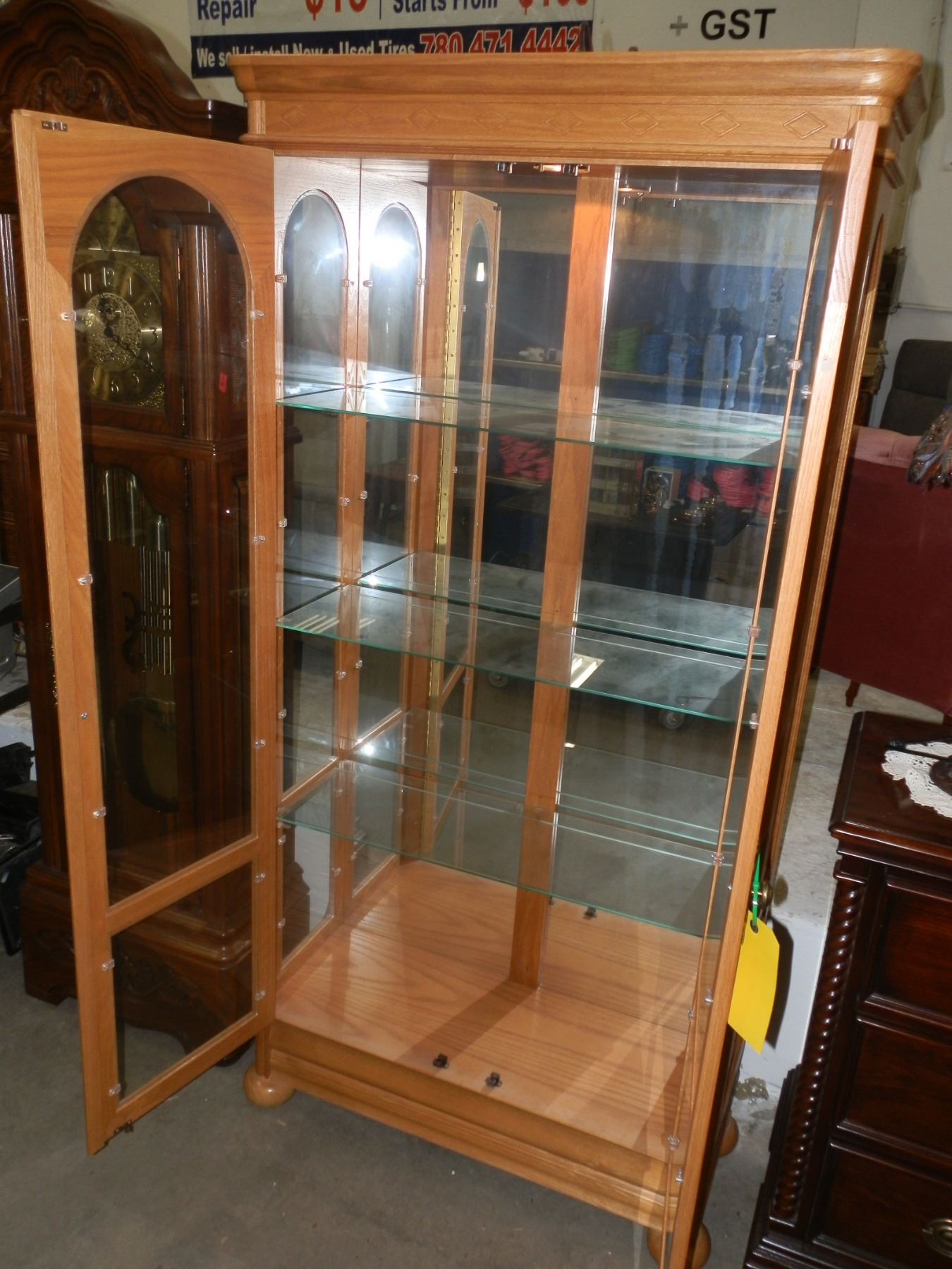 Display Cabinet with mirror backing and glass shelves inside, 75 1/2"H, 3 feet w 14" Deep in good condition...used
