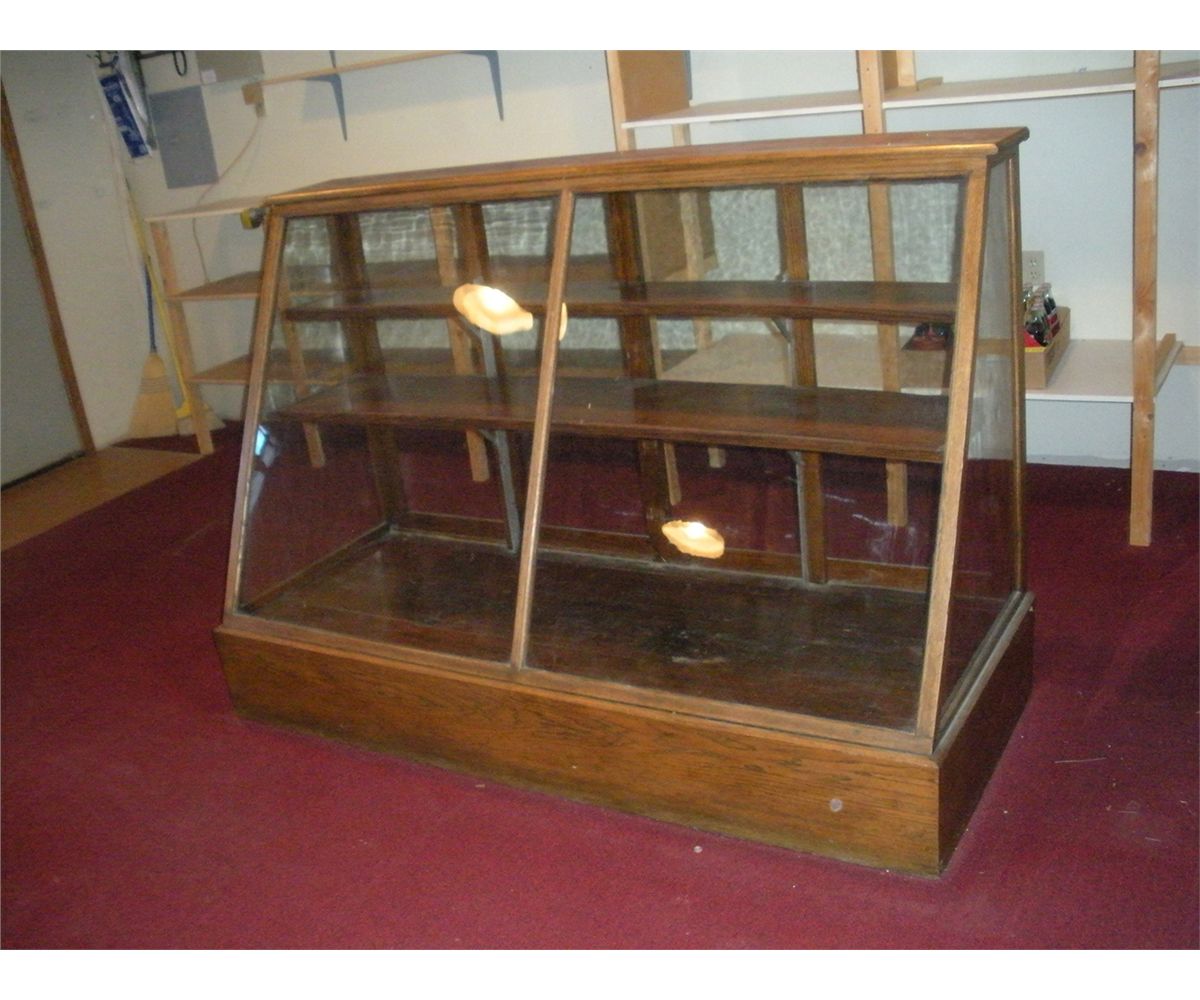 Upright, slant front display case. Glass front and sides. 2 shelves, two sliding doors at the back. 6’ long, 49” high, 29” deep at the bottom. FOB Prescott, AZ. Good condition. - HKA#66348