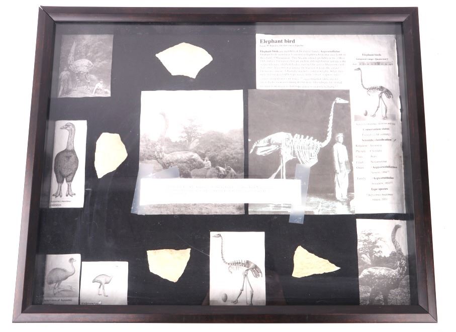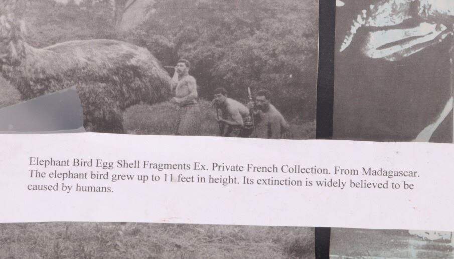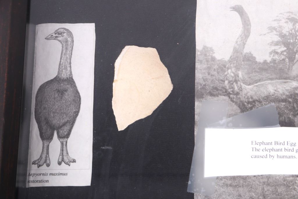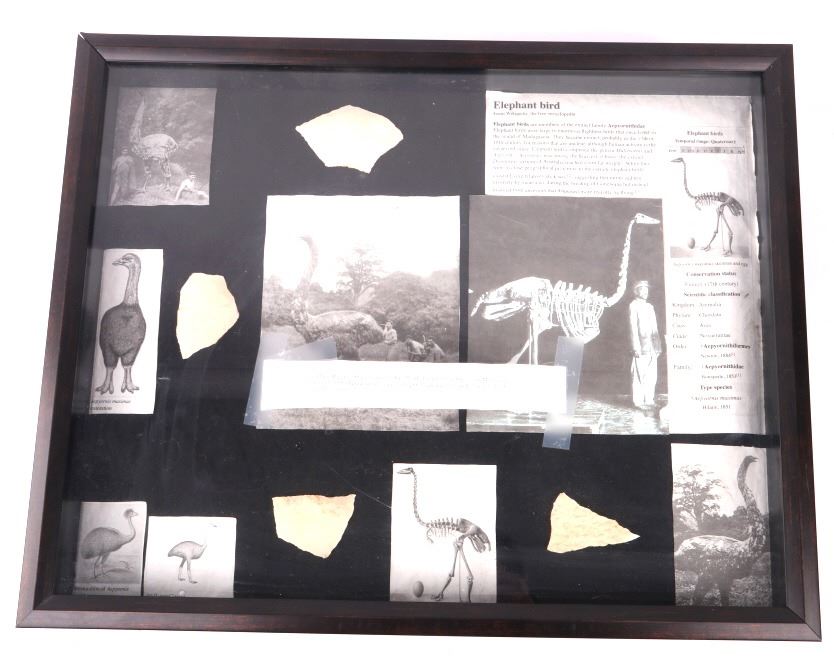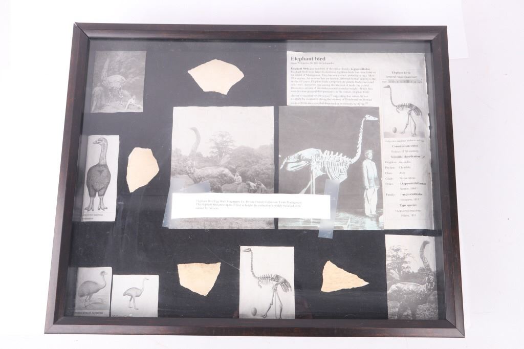 Offered in this lot is a framed display case of egg shells fossil fragments from the extinct Elephant Bird. The ancient fossil fragments originate from Madagascar. The fragments are framed with nine pictures of the bird and elephant bird skeleton. The elephant bird, or Aepyornis Maximus, lived in pre-historic ancient times. The fragments were found south of Madagascar. The overall condition of the four pieces is good for their ages. The framed case has some minor damage and separation at the corner. This measures 21 1/2" wide by 17 1/4" tall by 2 1/4" deep.