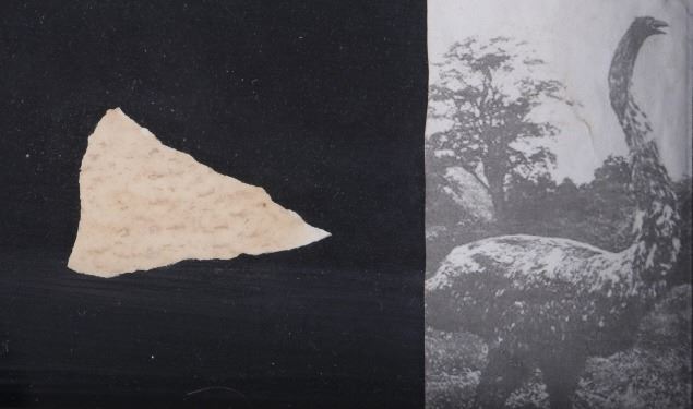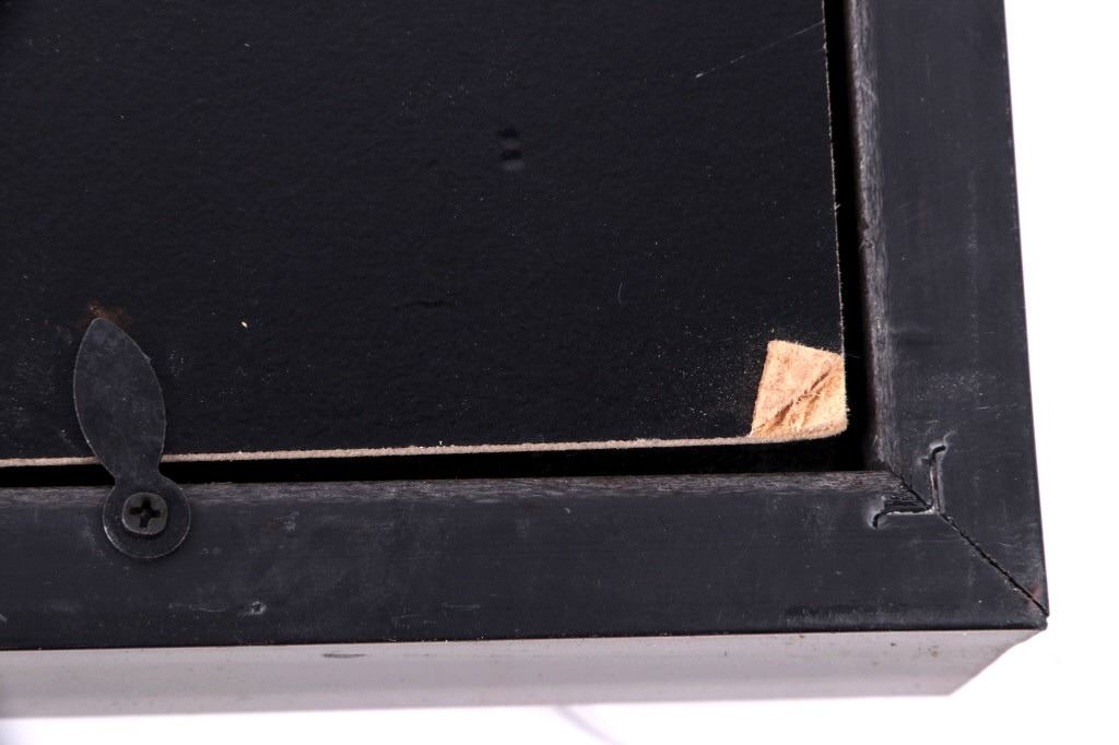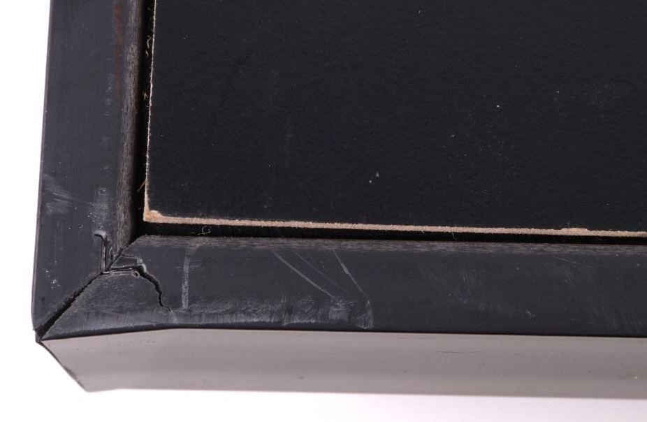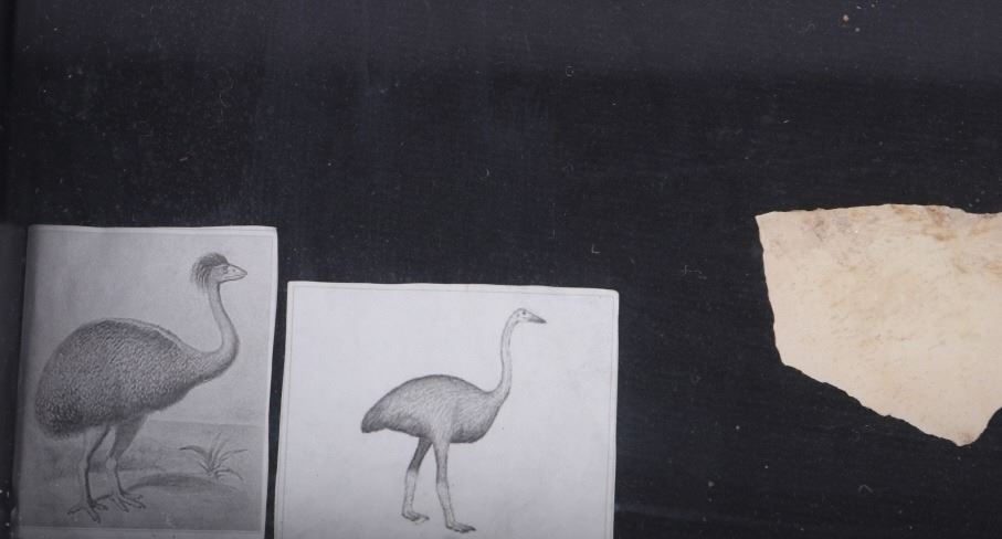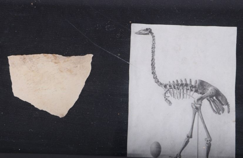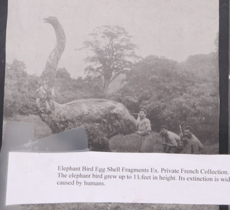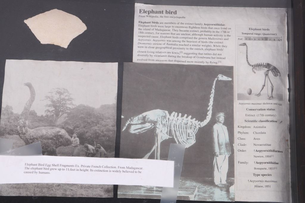 Offered in this lot is a framed display case of egg shells fossil fragments from the extinct Elephant Bird. The ancient fossil fragments originate from Madagascar. The fragments are framed with nine pictures of the bird and elephant bird skeleton. The elephant bird, or Aepyornis Maximus, lived in pre-historic ancient times. The fragments were found south of Madagascar. The overall condition of the four pieces is good for their ages. The framed case has some minor damage and separation at the corner. This measures 21 1/2" wide by 17 1/4" tall by 2 1/4" deep.