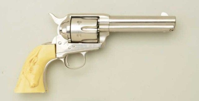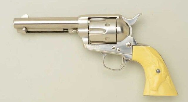 Display blank non-gun copy of a Colt SAA revolver, .44 cal., 4-3/4” barrel, nickel finish, faux raised ivory grips, #112737. This display piece is in overall very good condition; action needs adjustment, gripsshow raised steer heads on side; grips are loose and need fitting. Great for display or for a re-enactor (next lot is mate to this piece and numbered the same). Est.: $250-$500.