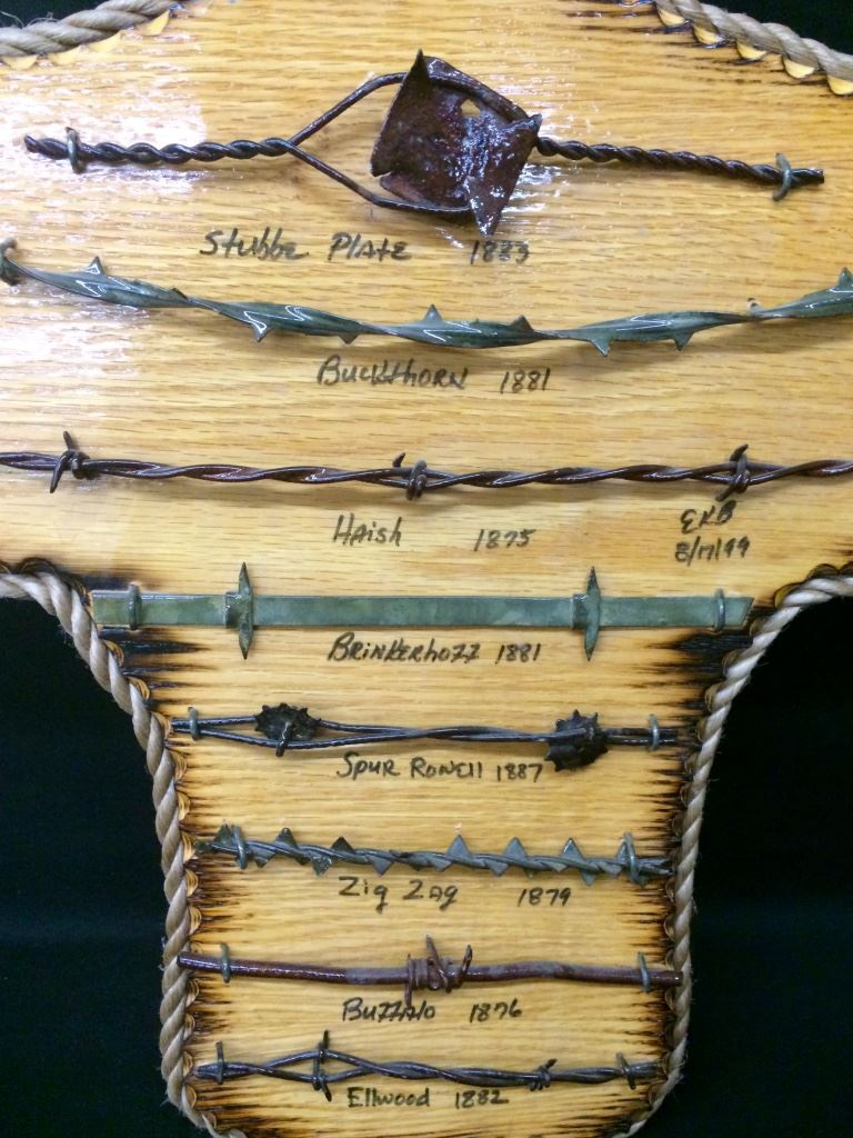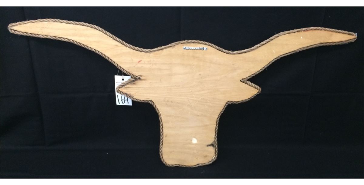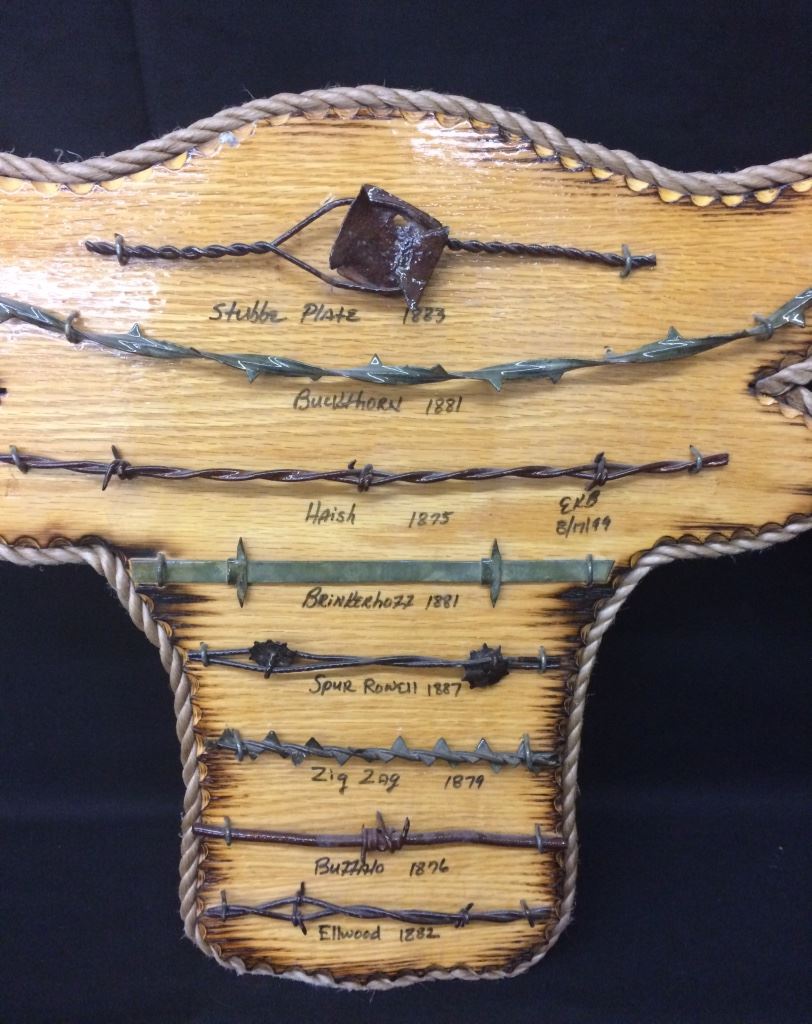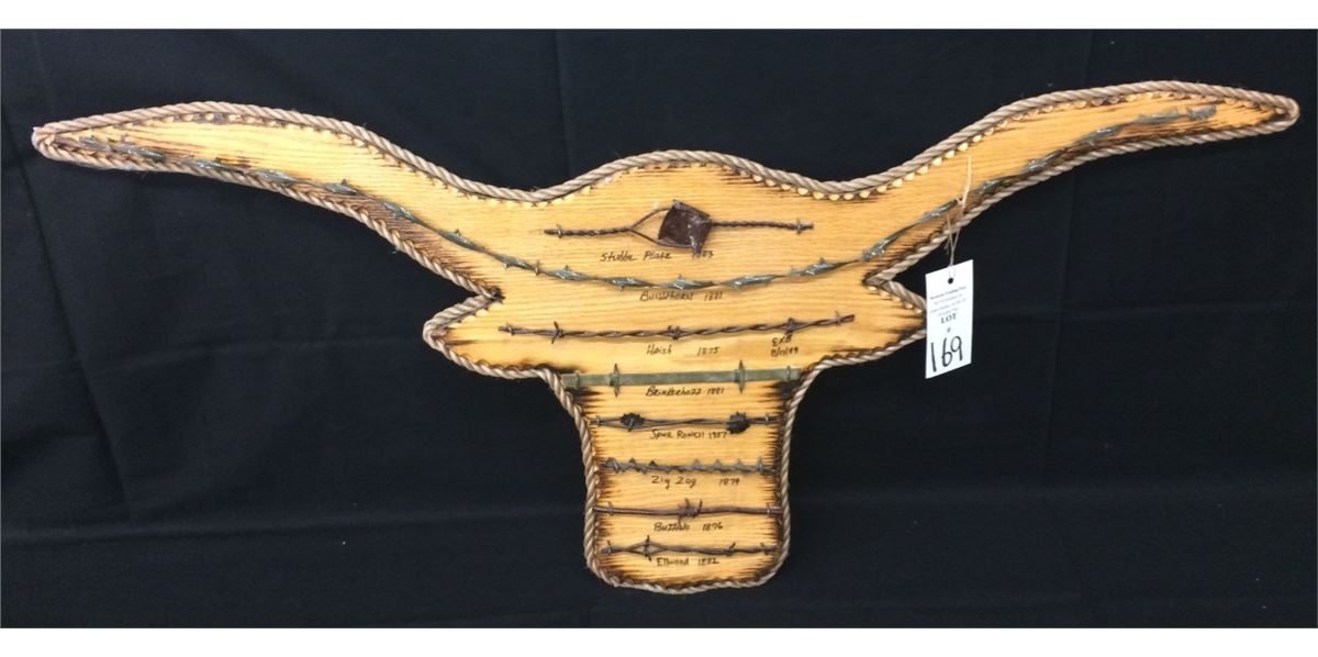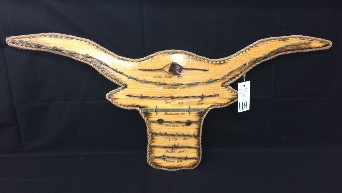 This barbed wire display is on a piece of wood in the shape of a steers head. It has samples of 8 different types of barbed wire from the 1800s. Overall it is 42” wide and 18” high. Made so it can hang on the wall if desired. Good condition. Shipping: There will be a $7 handling / packaging fee for shipping this lot. The actual cost of postage will be added on top of that.