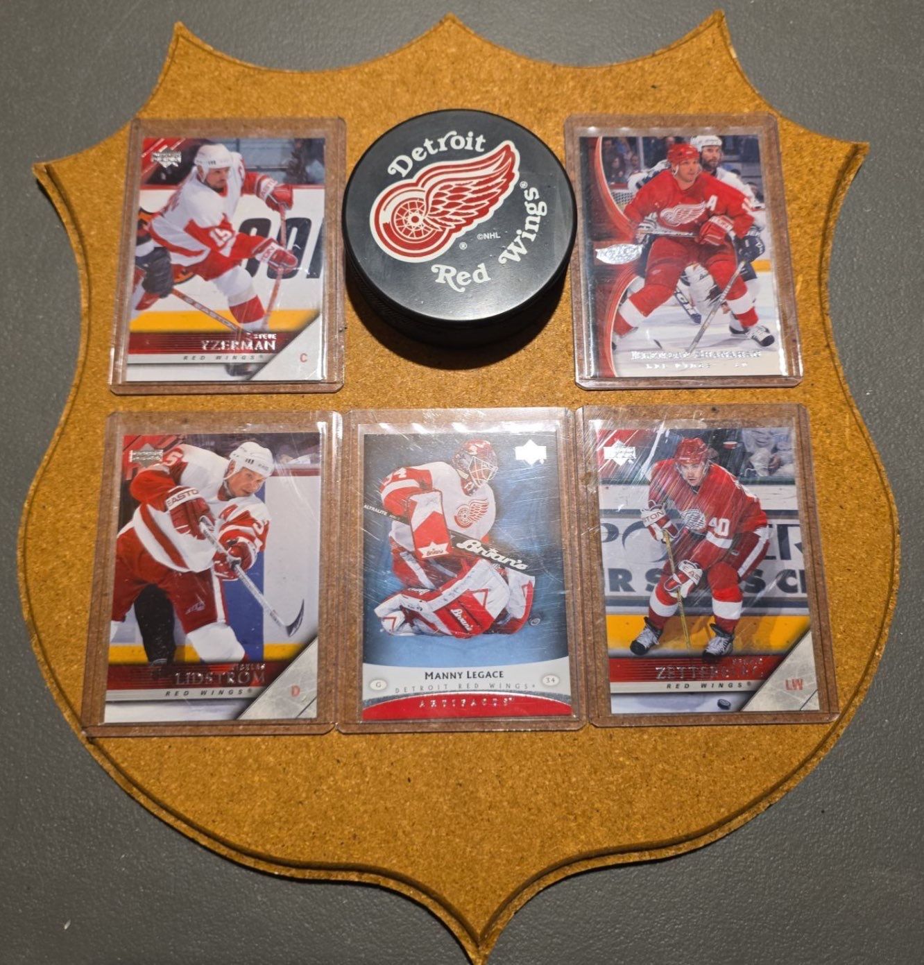 Display of Detroit Red Wings Hockey Memorabilia w/A Puck & Trading Cards