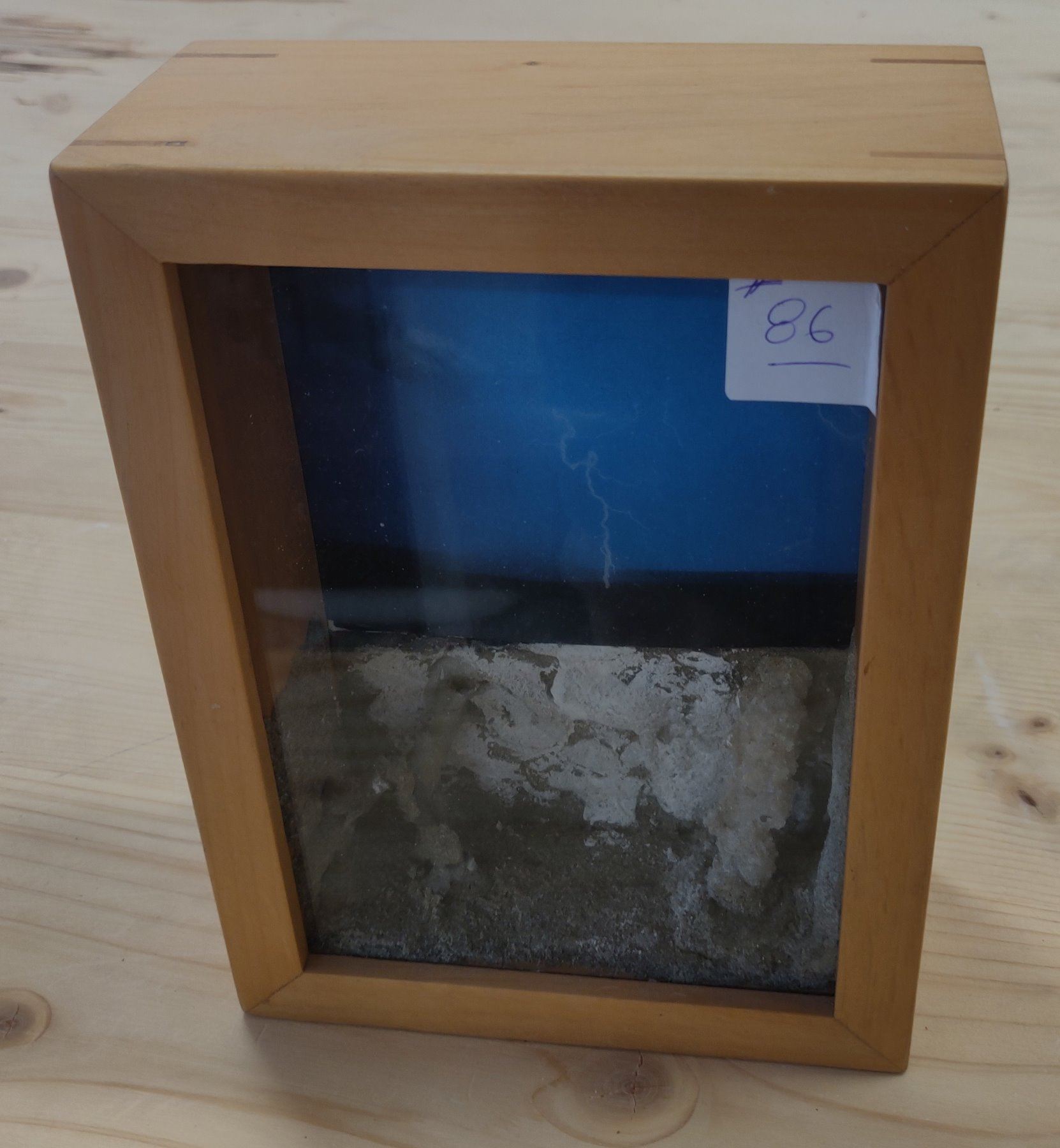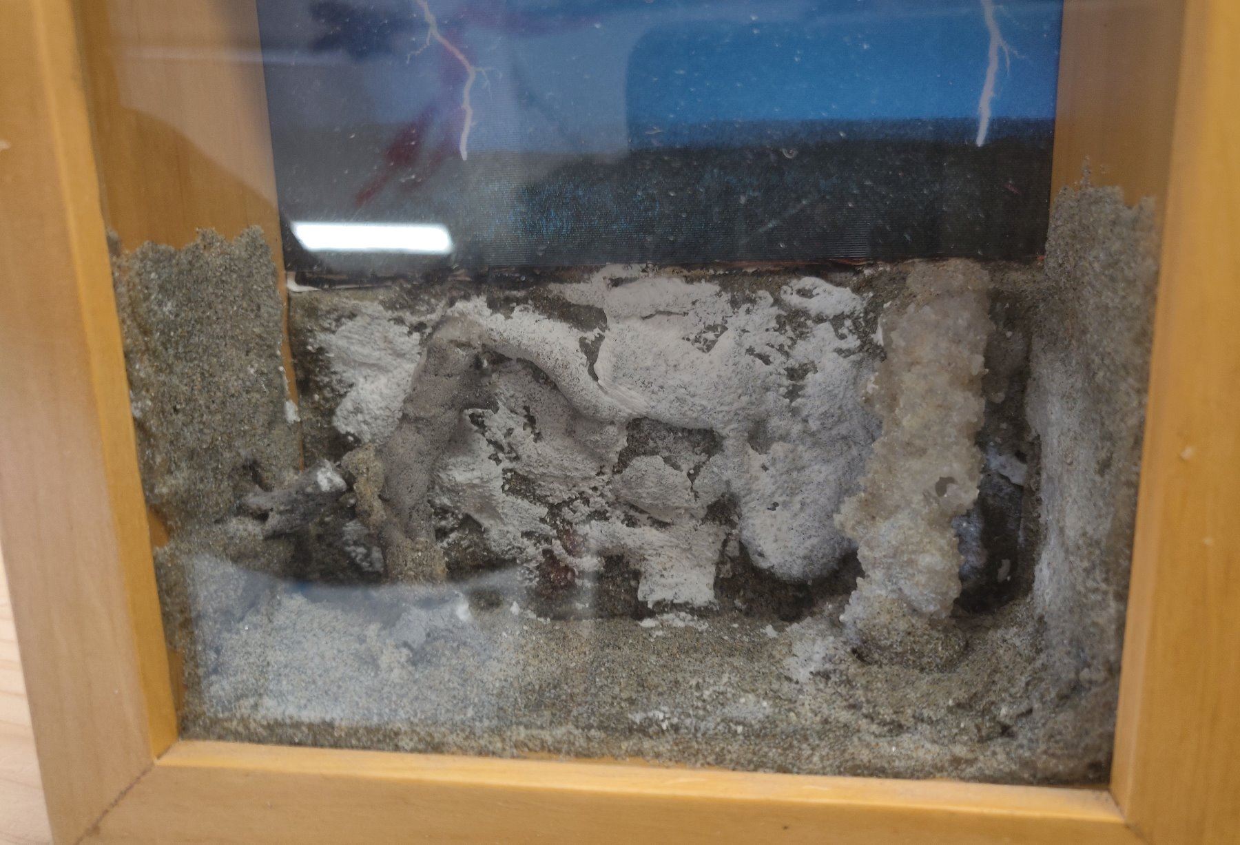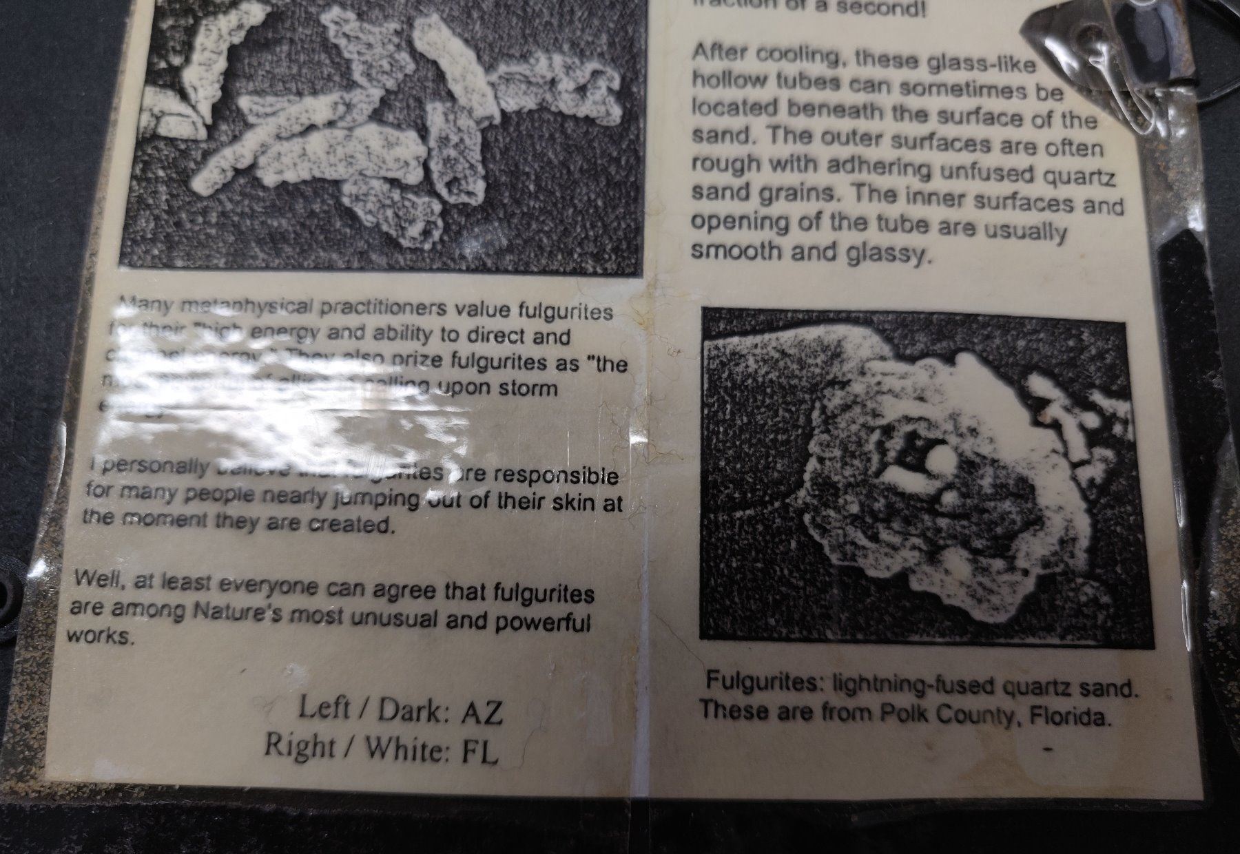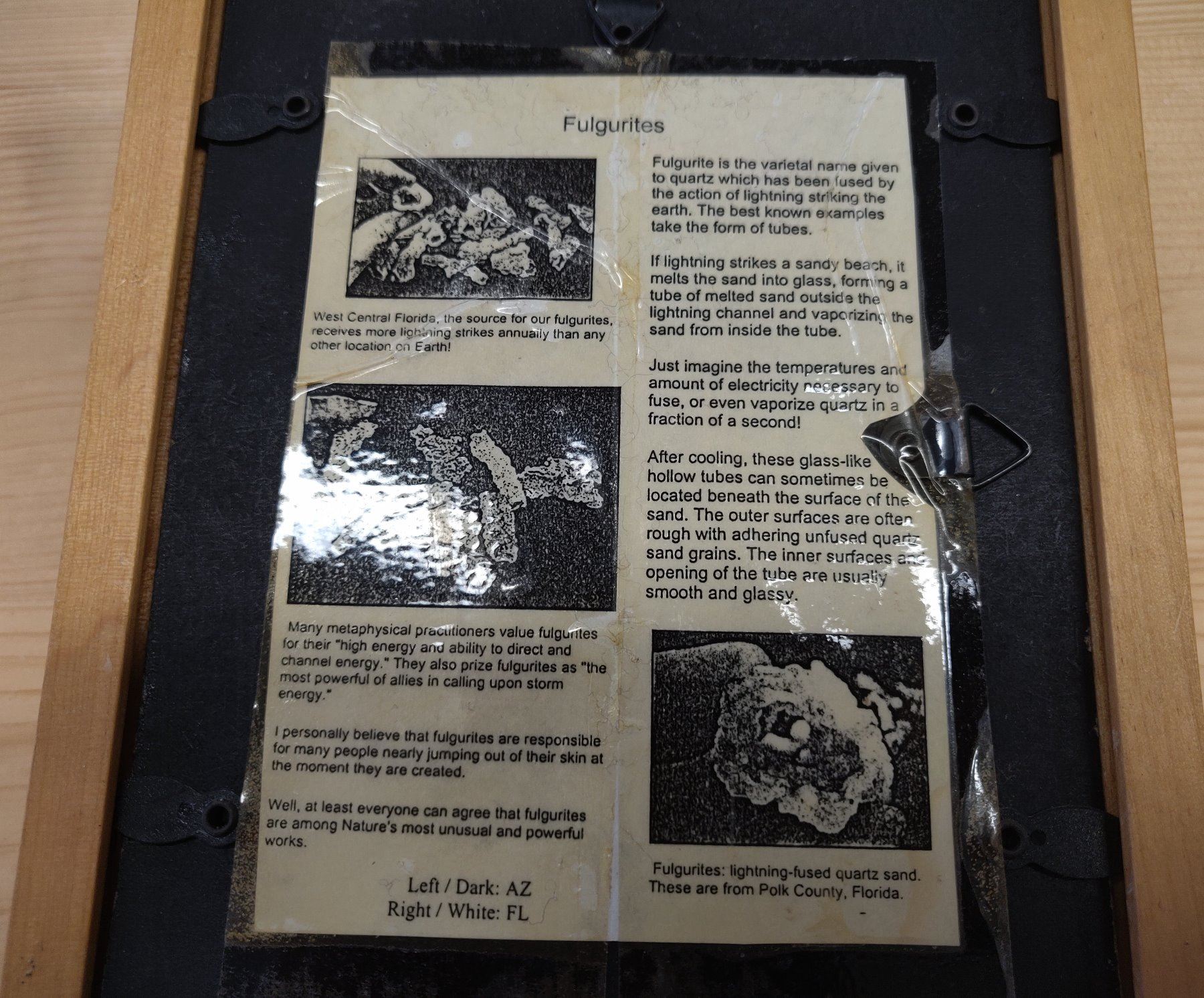 Display of Fulgurites, c. 100 years old. Made of sand, the frame measures approx. 6" x 4" x 3". Arizona, Florida. Frame included. Condition: Good, see images. Shipping: $18.50 w/insurance and signature, due to size.