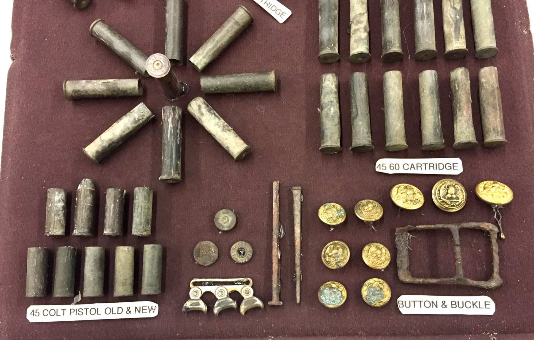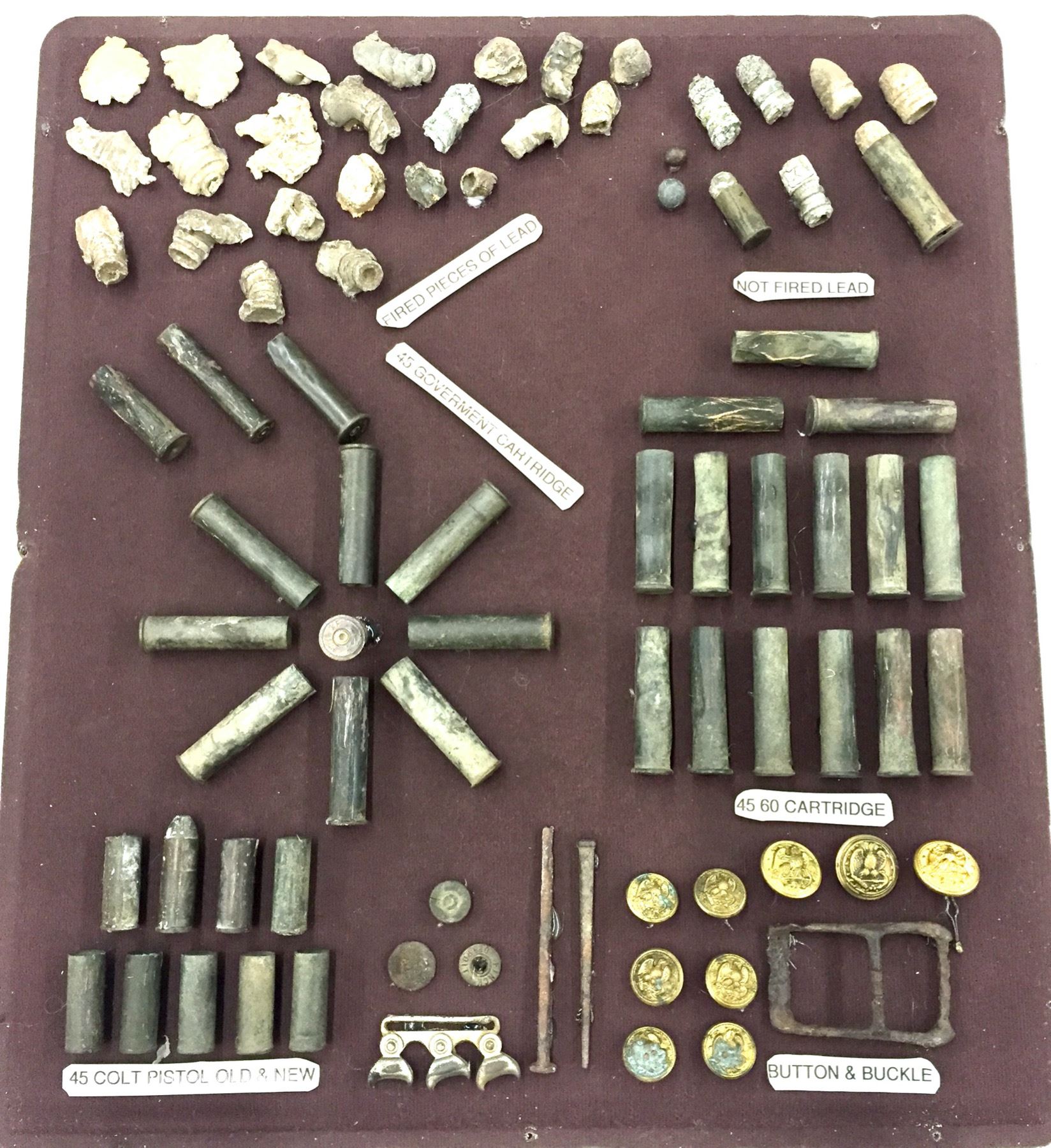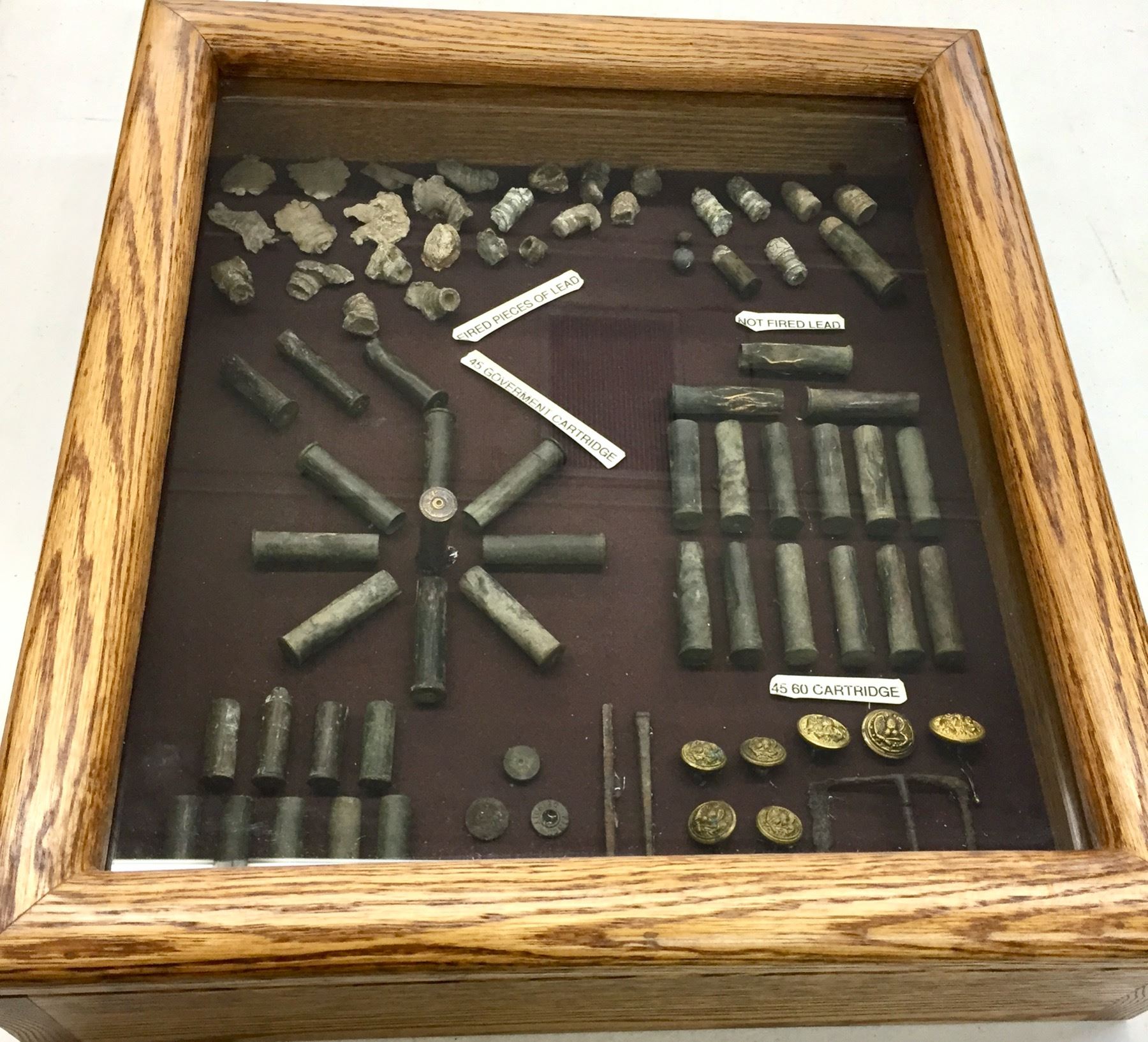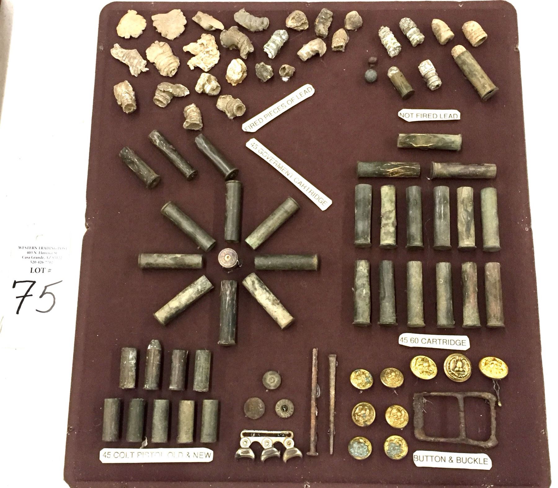 Description: Included for sale in this lot is a wonderful display of miscellaneous found pieces of lead, government cartridges, buttons and other military artifacts that would make a great addition to your collection. Items were found in and around the Chiricahua Mountains and all are relics from the Indian Wars Era. They are nicely custom framed. Maker: Unknown. Approx. Age: Antiques. Size: 16â€w x 18†long x 4†deep. Condition: As found. Please look closely at the pictures - they are an important part of our description. Shipping: There will be a $10 handling / packaging fee for shipping this lot. The actual cost of postage will be added on top of that.