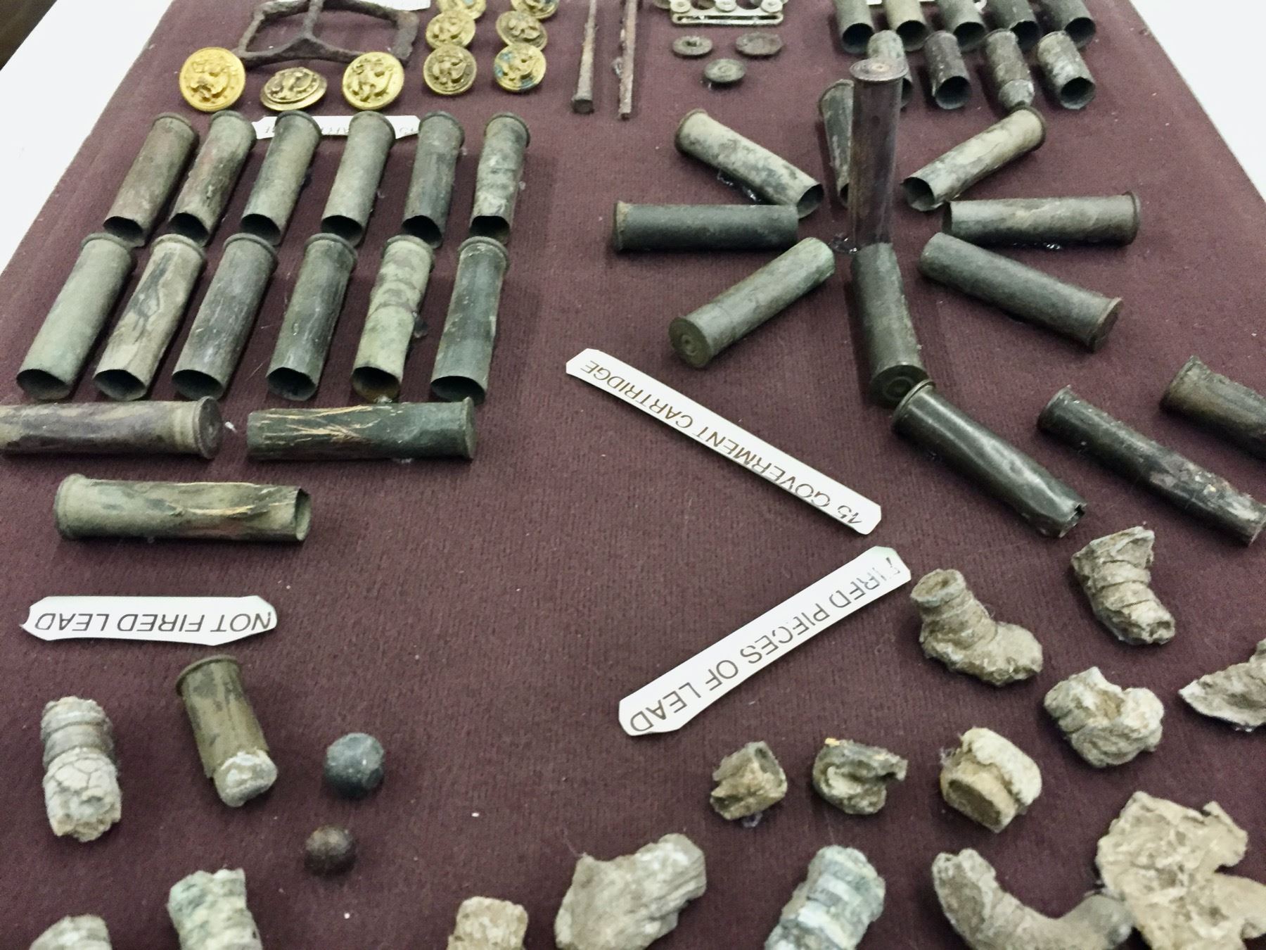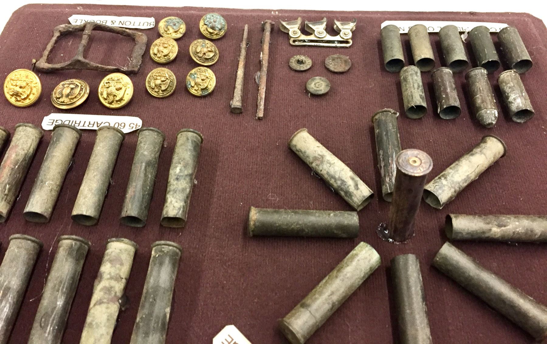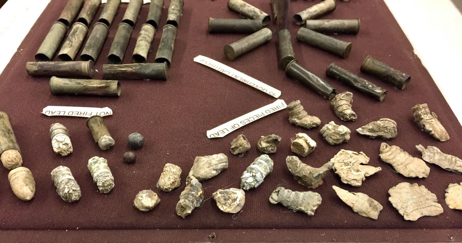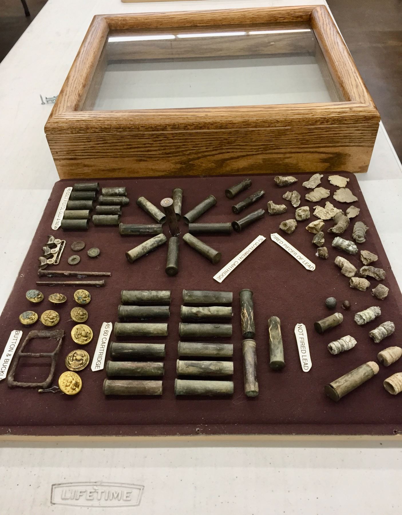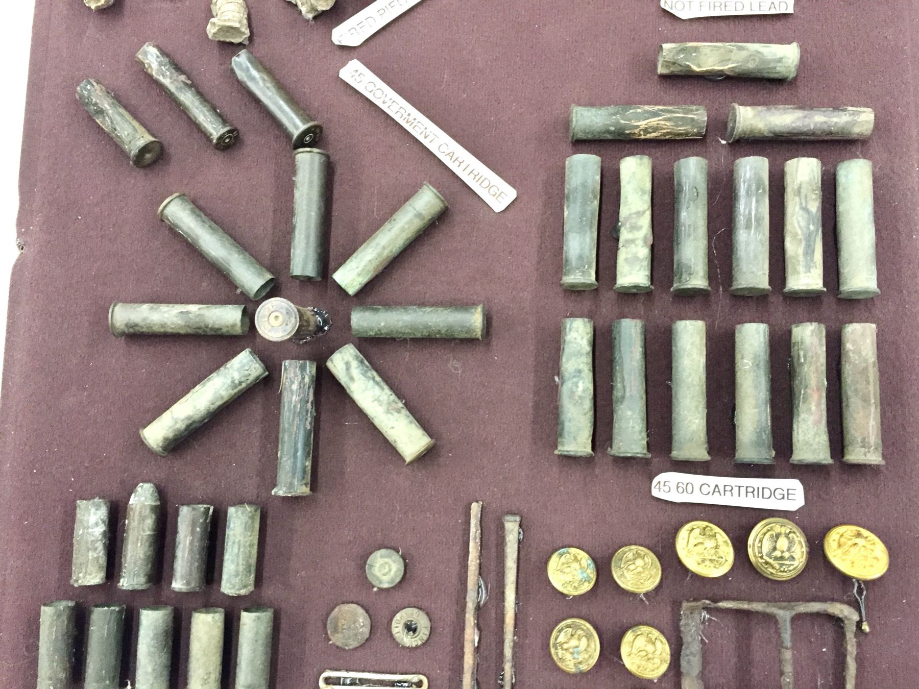 Description: Included for sale in this lot is a wonderful display of miscellaneous found pieces of lead, government cartridges, buttons and other military artifacts that would make a great addition to your collection. Items were found in and around the Chiricahua Mountains and all are relics from the Indian Wars Era. They are nicely custom framed. Maker: Unknown. Approx. Age: Antiques. Size: 16â€w x 18†long x 4†deep. Condition: As found. Please look closely at the pictures - they are an important part of our description. Shipping: There will be a $10 handling / packaging fee for shipping this lot. The actual cost of postage will be added on top of that.