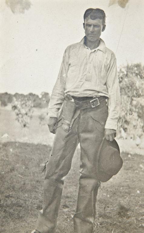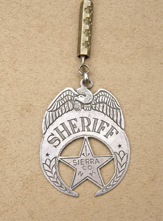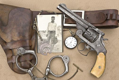 Display of items belonging to Sheriff Max L. Kahlar, Sierra County, New Mexico Territory including a Smith & Wesson First Model .44 DA top break revolver, serial #18523, pair of Cobb or Bean’s patent handcuffs with key,stock leather double loop holster and cartridge belt, open face pocket watch and chain, framed photo of Kahlar and an outstanding jeweler-made crescent star fob badge marked “Sheriff”; “Sierra Co. N. M.”.Per a notarized letter dated March 23, 1994, Raul Guillen, executor of the estate of John Romo of Chama, New Mexico, the Smith & Wesson, the handcuffs and the silver watch and chain with attached Sheriff’s badge werethe property of Mr. Romo, Grandson of Max L. Kahler, who used them in his duties as Sheriff of Sierra County, New Mexico, 1894-1896 and then again in 1898-1900. The Smith & Wesson in this lot is in overall very good condition showing a brown patina on metal surfaces with some scattered points of erosion and pin prick pitting; crisp action, sharp markings, overall fair to good bore, butt strap has been grooved, possibly in