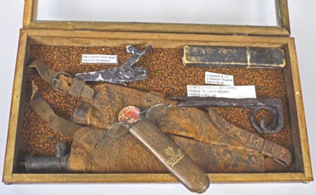 straight razor, Fort Donelson dug rifle lock shot and powder pouches and two Confederate Officer's horse tether (see Lord's II page 196)