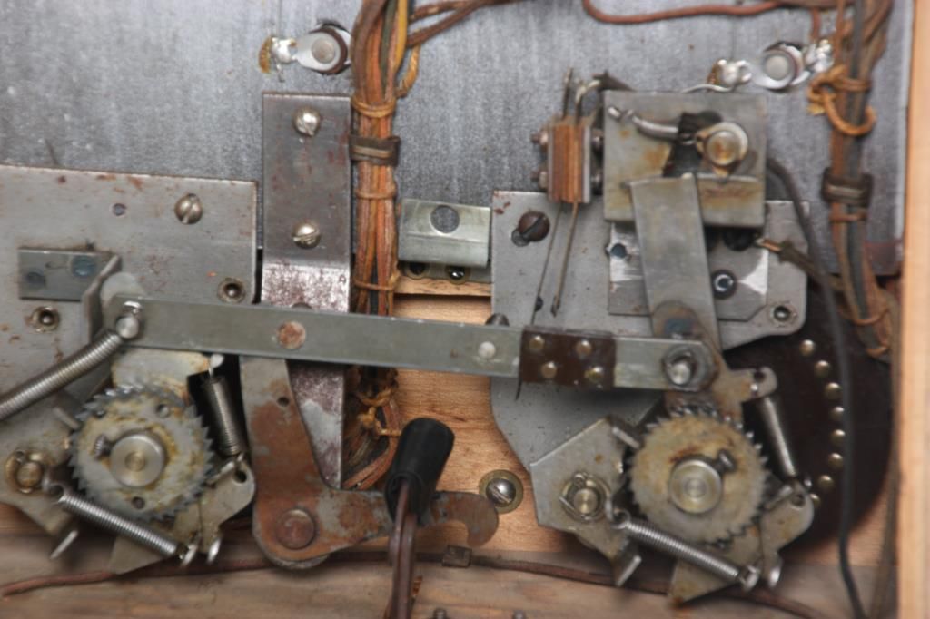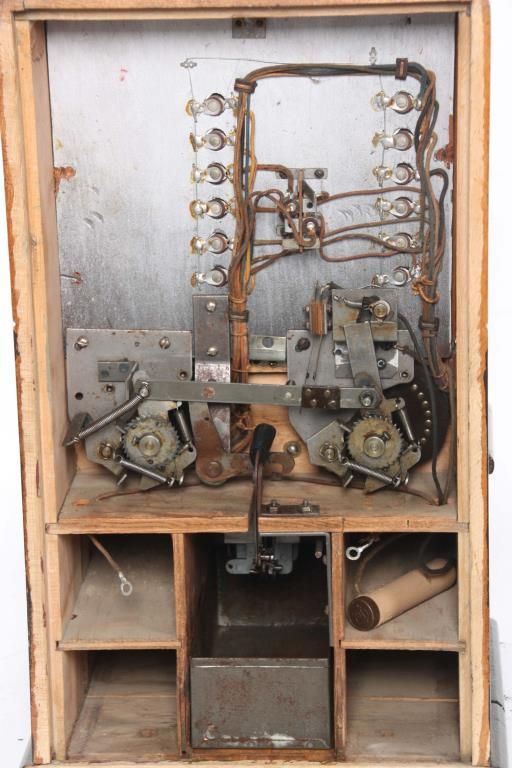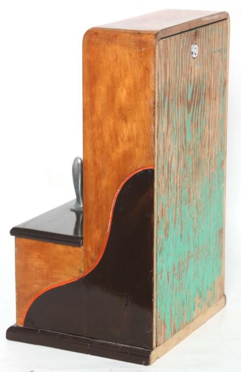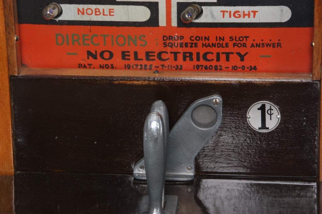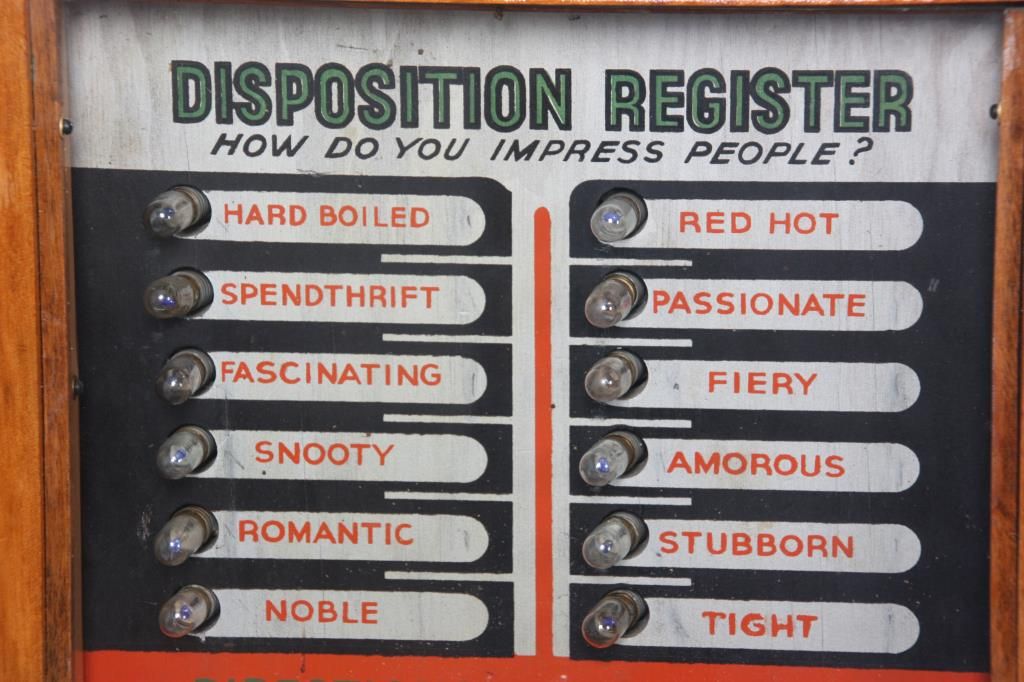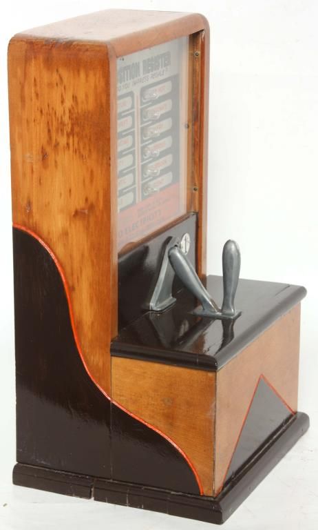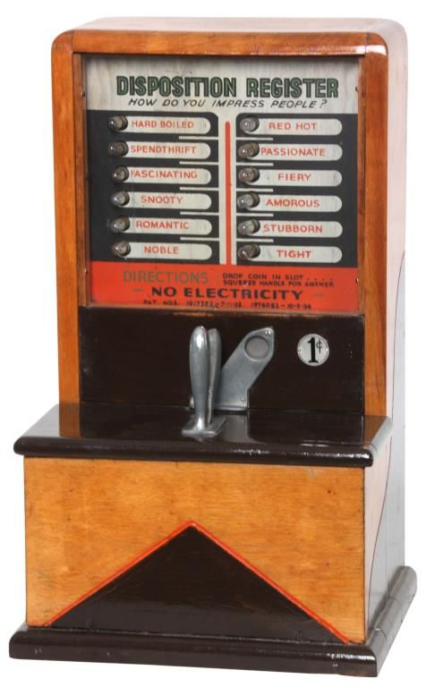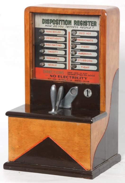 Disposition Register Squeeze Handle Arcade Machine. By the Exhibit Supply Co. circa 1930-1940; 1 cent coin operated machine with a squeeze lever handle lighting up one of the 12 predetermined “disposition indicators”. 19 in. high x 11.5 in. wide x 9.5 in. deep.