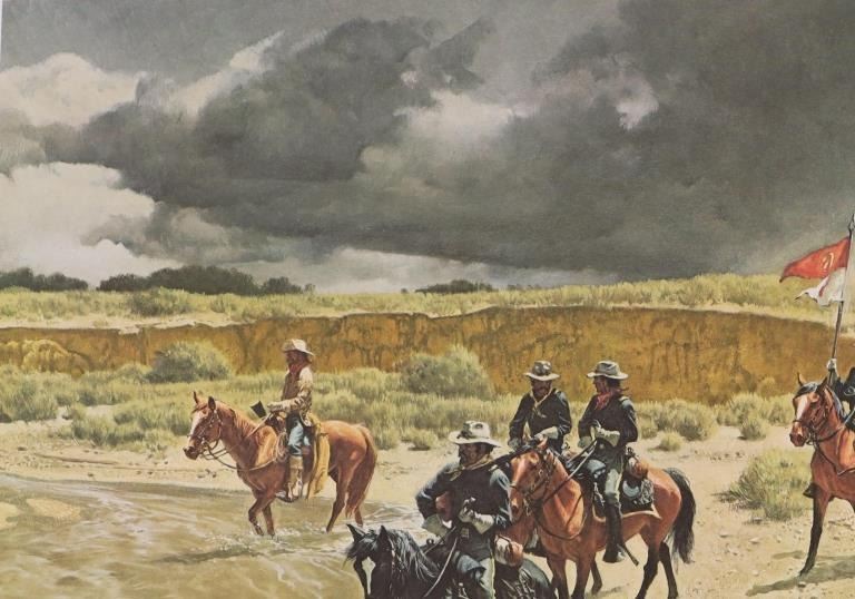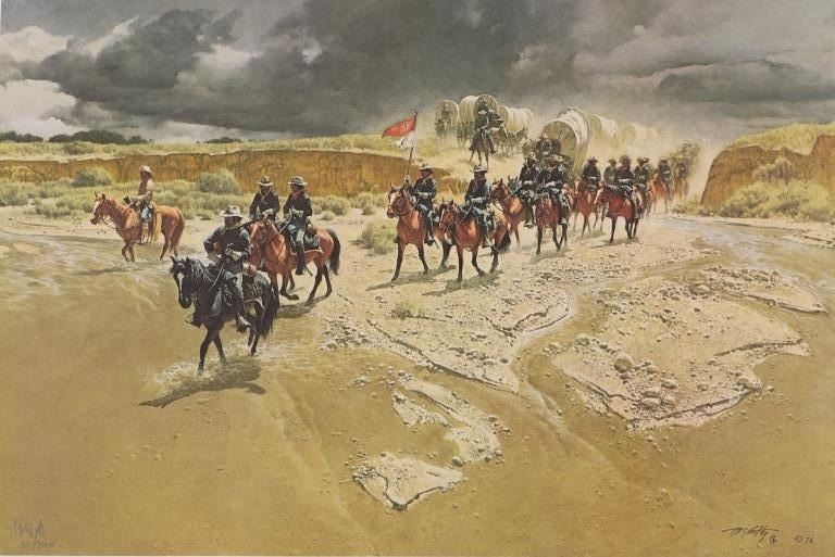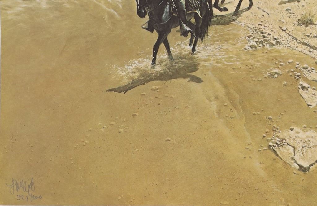 For your consideration is this Frank McCarthy Signed Limited Edition, "Distant Thunder", #327/1000, comes with COA, 1977. "This is the Cavalry at work, on patrol in Kansas during the 1870's. It was in the Early West that the Cavalry grew into a legendary part of American history. There are many great characters written on the pages of those early days - Indians, trappers, cowboys. And the Cavalryman's chapter is as big as any." Frank McCarthy's (1924-2002) dynamic paintings frequently featured the people of the west with a special emphasis on the Plains Indian, mountain men and cavalry that comprised the lore and lure of the Old West. Appropriately entitled the “Dean of Western Action Painters,” Frank McCarthy’s art was unsurpassed for its motion, drama and absolute attention to accuracy and detail. Highly collected and frequently imitated, Frank McCarthy’s works were treasured throughout the world as classic examples of contemporary Western Art. Retrospective showings of Frank McCarthy’s paintings have been held at the Museum of the Southwest, Midland, Texas; the R.W. Norton Museum in Shreveport, La.; the Thomas Gilcrease Museum in Tulsa, Ok.; and in 1992, at the Cowboy Artist of America Museum (now known as National Center for American Western Art) in Kerrville, Texas. Frank McCarthy was invited to join the prestigious Cowboy Artists of America organization in 1975 and was an active member in the CAA group for 23 years. He was inducted into the Society of Illustrators Hall of Fame in 1997 Three books of his paintings have been published-The Art of Frank C. McCarthy, Frank C. McCarthy, Fifteen Anniversary commemorative and The Old West, a leather-bound Collector’s Edition. More than 100 limited edition art prints of his paintings have been published since 1974 by The Greenwich Workshop. This Limited Edition Signed print is in very nice condition, no obvious marring noted. Measures 20"W x 30"L.