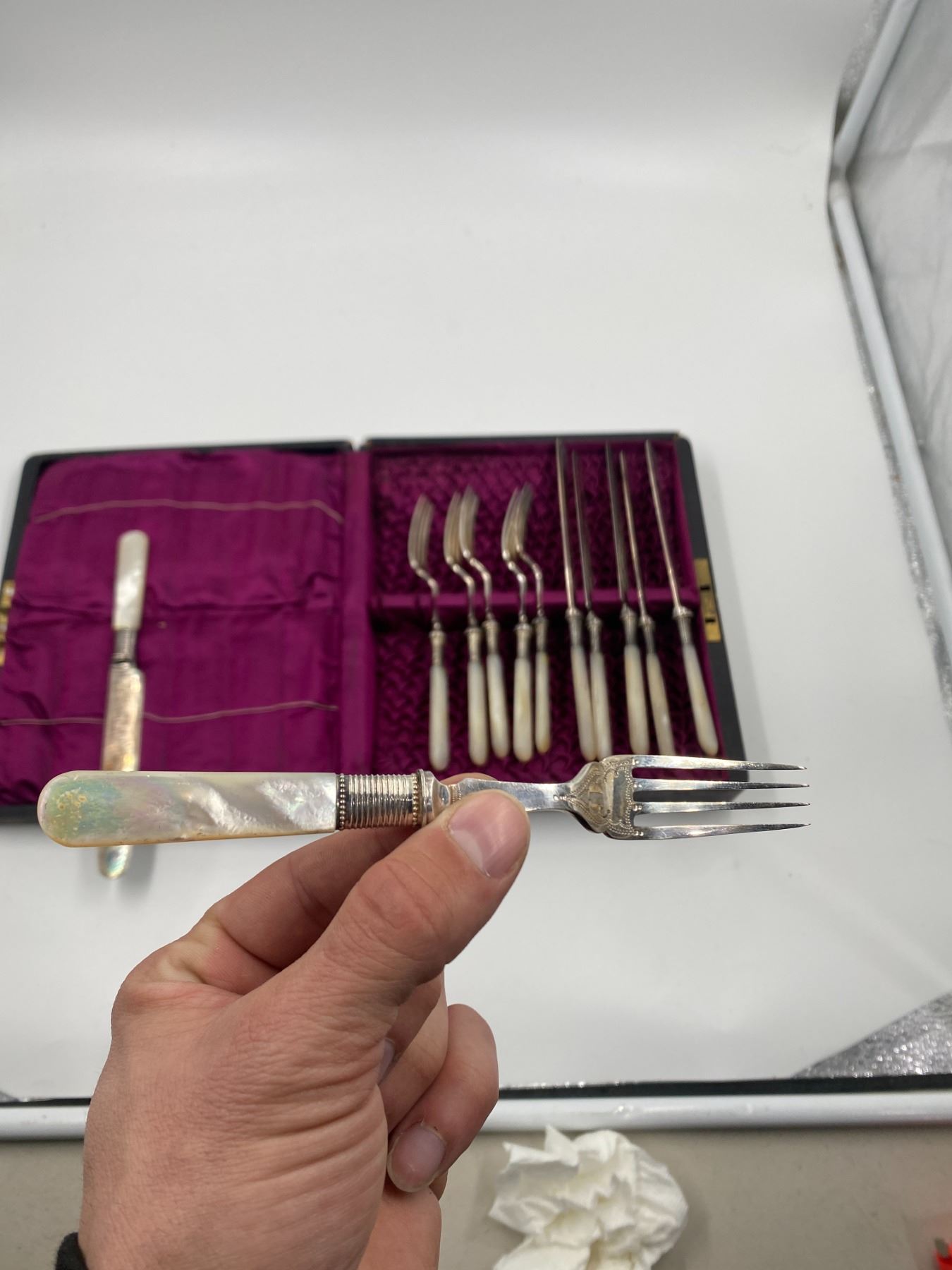 Cutlery is stored in a vintage box with purple fabric lining (the outside of box is weathered)